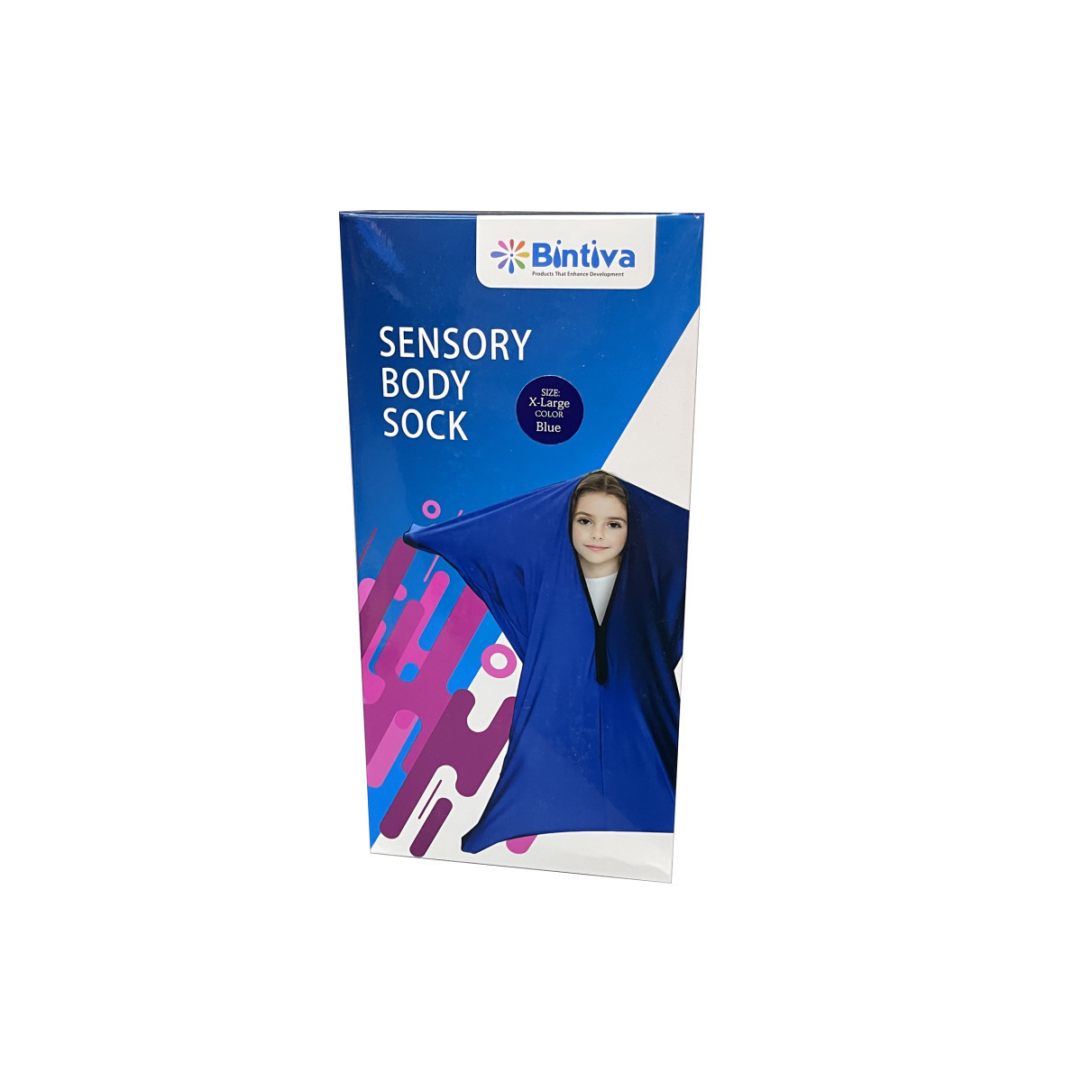 The body sock is a fun and exciting tool providing a compression hug throughout their body for children that crave sensory input. The sack is also recommended for developing motor planning skills, while establishing spatial and body awareness. Sensory sox are also used by professionals to organize, and calm children's minds before and after therapy sessions. The Bintiva compression sock is free of any adhesive type fasteners, so that no part of the hair, or body will get stuck. The sock is secured by utilizing simple to use snaps. The sensory sock is appropriate for children with sensory processing disorder (SPD), ADHD, autism, and typical children that enjoy the feeling of a hug. Includes 1 x-large sensory sock great for ages 12+.