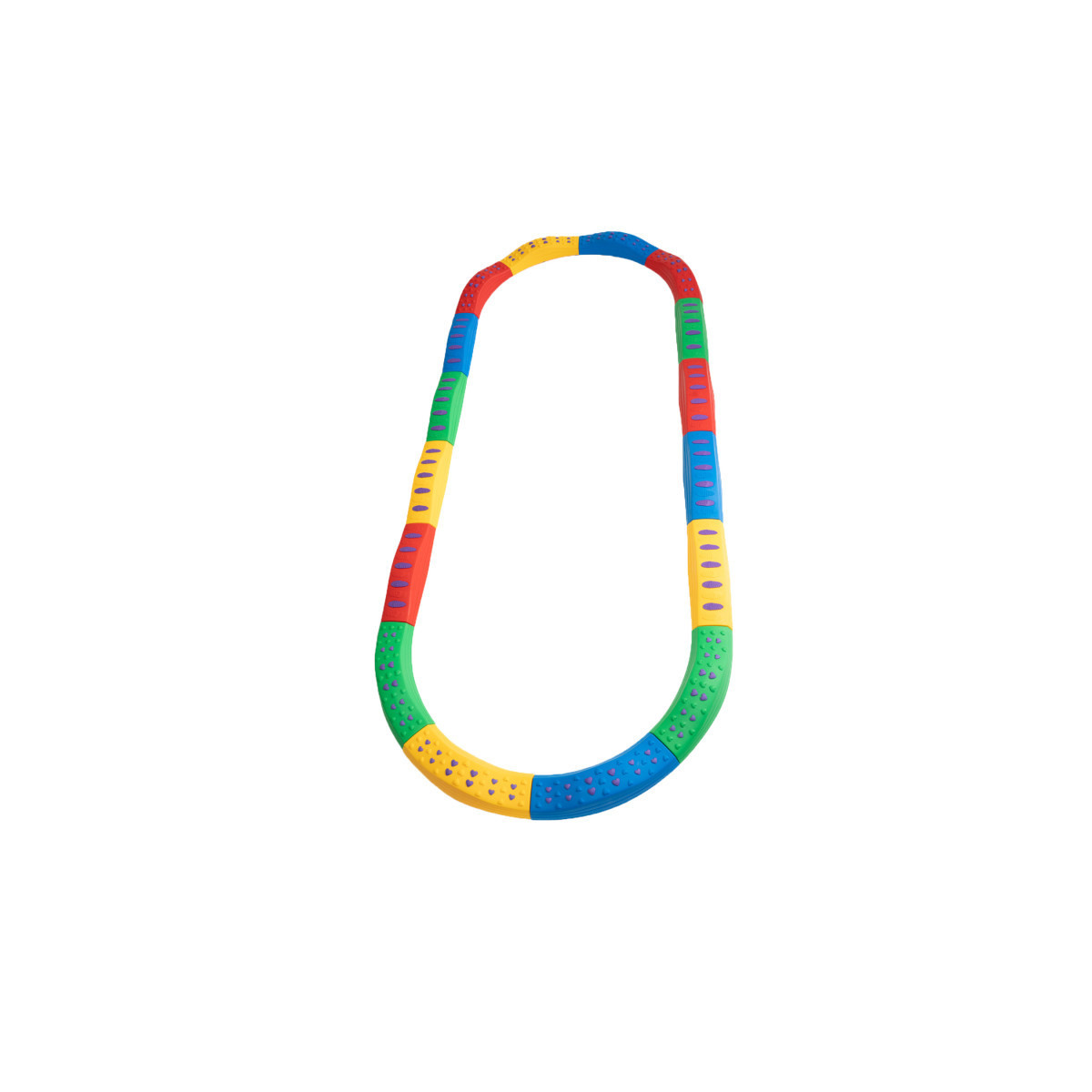 The balance path can be used to promote balance skills, motor planning, and gross motor coordination. It can also be used as an exercise tool, and to help build body and spatial awareness. The set includes 8 rounded pieces, 8 straight pieces, and 4 connectors. These can be set up in many different configurations, to accommodate all ages and abilities. The balance path is built with safe materials, and is safety tested to ensure that it does not contain any harmful materials. The bottom of each piece features rubber feet so that the path stays in place while in use. Each piece locks into the next so that the path will not break apart during use. The tactile bumps on the top of the balancing path provide sensory input to those that crave it.