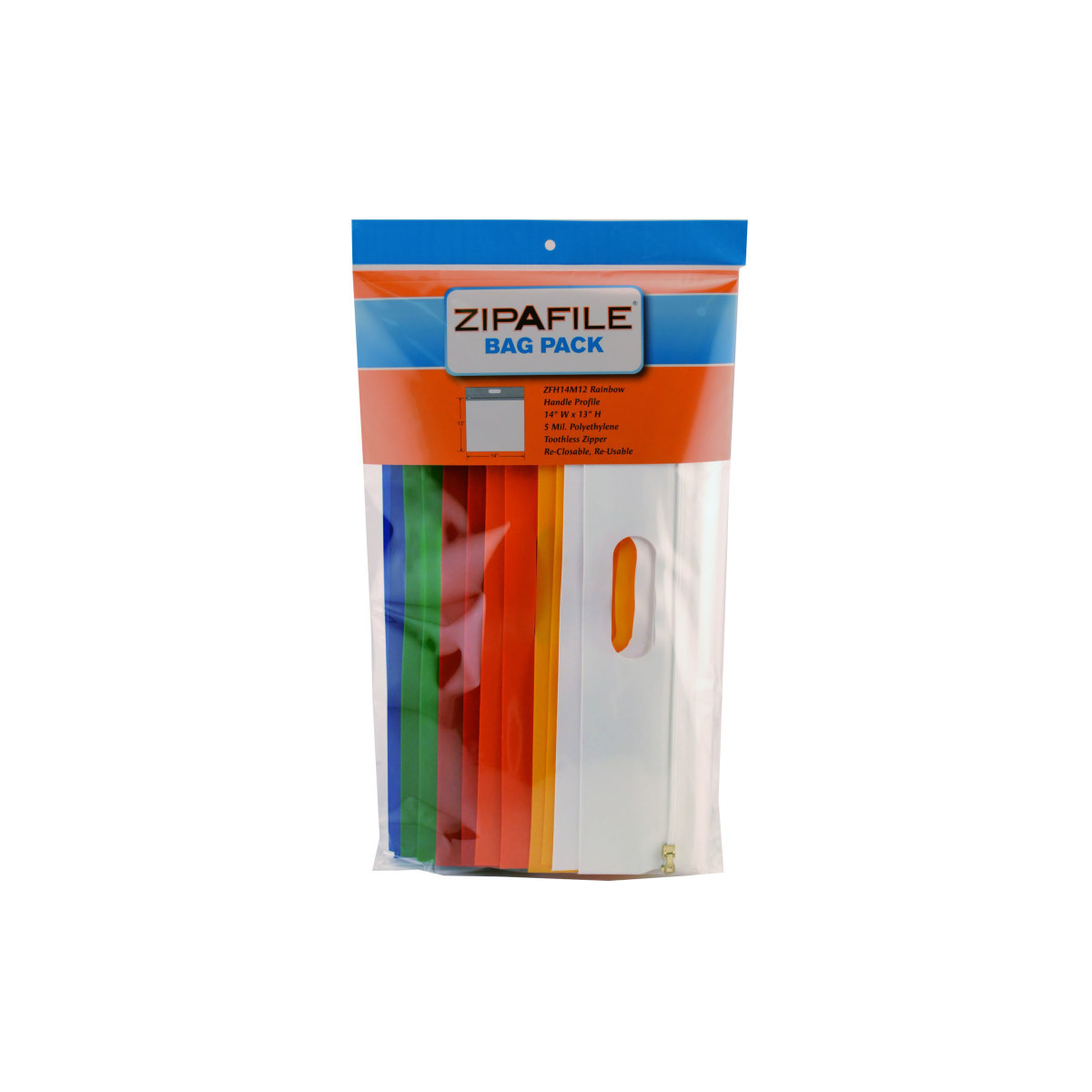 ZIPAFILE is a heavy duty Storage Bag with a reclosable zip closure. ZIPAFILE is a great solution for organization of learning center materials and ideal for transporting reading and homework assignments while protecting the supplies from wear and tear. ZIPAFILE is made of clear, 5 Mil. low density polyethylene, that is acid free and CPSIA Compliant. Handle colors include blue, green, red, yellow, orange and white. Each bag measures 14" W x 13" H.