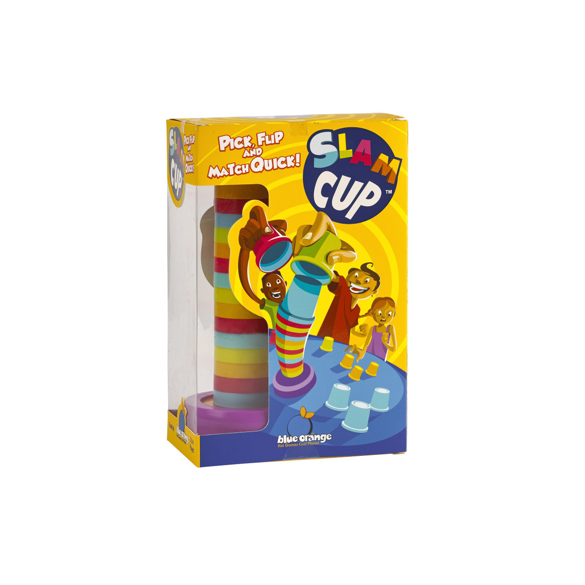 Match cups then slam them down fast! Slam Cup is an intensely fast speed matching game. Match the color on the inside of your cup to the color on the outside of the top cup on the stack. Then slam your cup on top as fast as you can before someone beats you to it! The first player to stack all their cups is the winner!