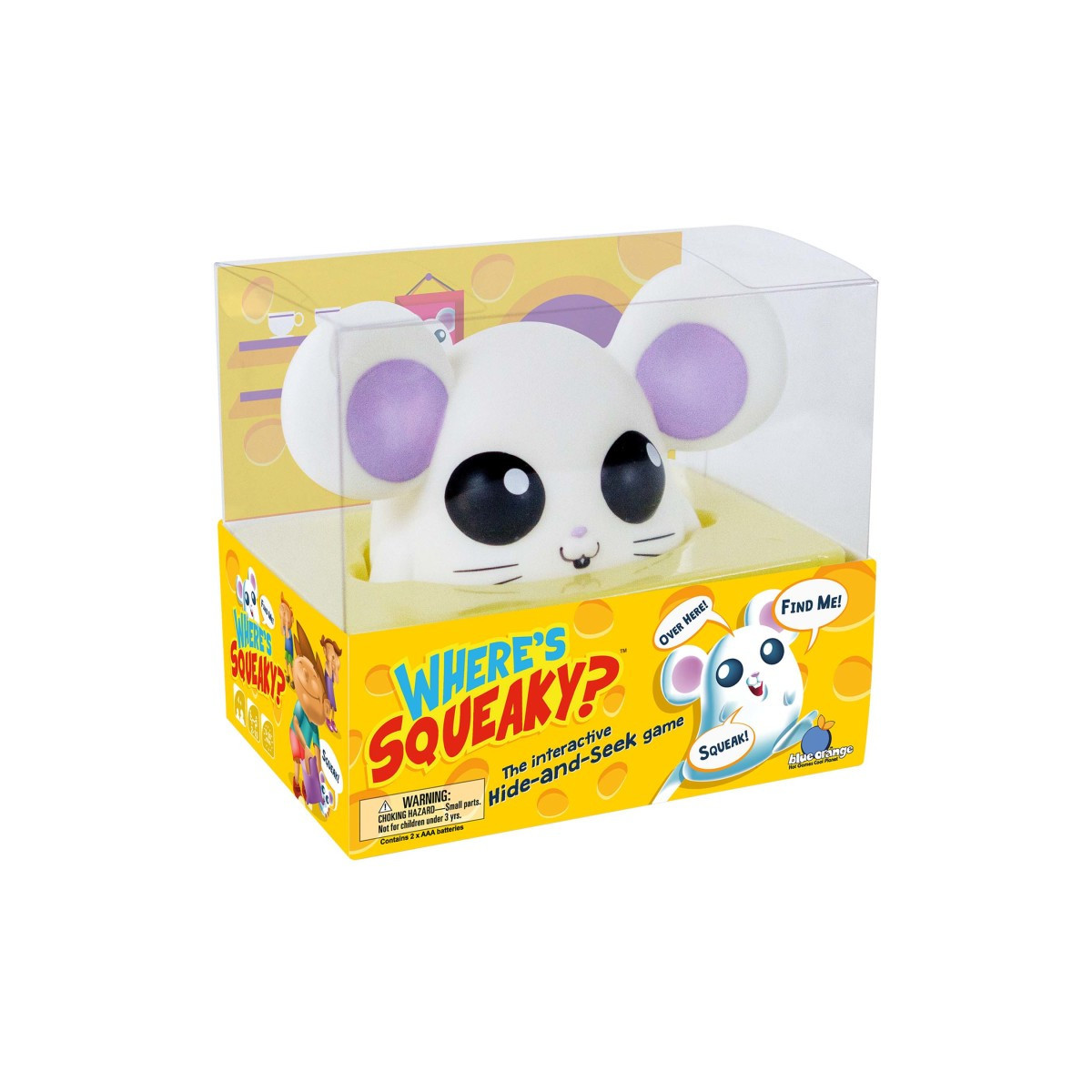 Can you find Squeaky the Mouse? One player hides her, and the rest of the players must find her! If you listen closely, you can hear her laughing and giggling louder and louder! Once you find the silly little mouse, return her back to her Cheese Box so she can finish her meal!