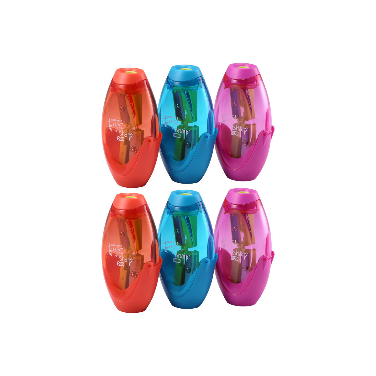 Sharpen two pencil sizes with this jumbo pencil sharpener! It features two holes - one for standard pencils and one for jumbo or "starter" size pencils. Starter pencils are thicker than regular pencils, making them easier to hold and maneuver. This makes them ideal for beginner writers. Now you can sharpen both sizes with only one sharpener! Featuring bright, kid-friendly colors, each jumbo pencil sharpener is randomly selected when ordered for a fun surprise on arrival! A part of the Twist-n-Sharp™ family, this unit also features a ratchet mechanism. The ratchet allows you to sharpen pencils faster and easier! The easy-open shavings tray keeps your desktop clean and tidy. The Tip Saver Technology™ prevents oversharpening and extends pencil life. These features and more make this pencil sharpener a great choice for kids and classrooms everywhere. Sold as a pack of 6 in an assortment of bright and trendy translucent colors including blue, orange and pink (no color choice).