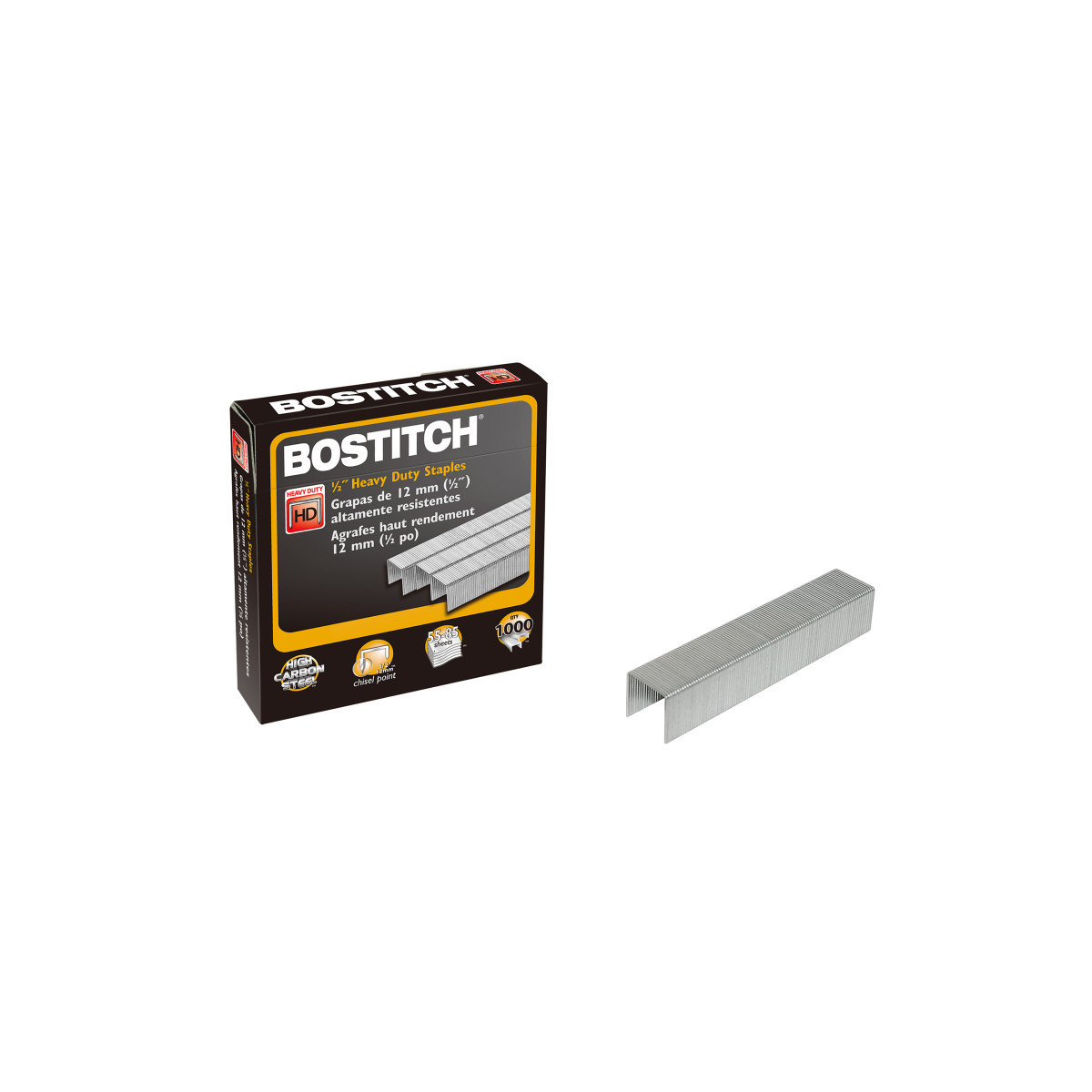 Our Premium Heavy Duty Staples were developed for optimum performance in most heavy duty staplers. Constructed from superior quality high carbon wire to reduce buckling and jamming. The finely honed chisel points deliver maximum penetration for maximum sheet capacity. Optimized 1/2" (12mm) leg length drives through significant 55-85 sheet stacks. For use in Bostitch Heavy Duty Staplers: 00540, B310HDS, and other branded heavy duty staplers. Each box includes 1000 staples.