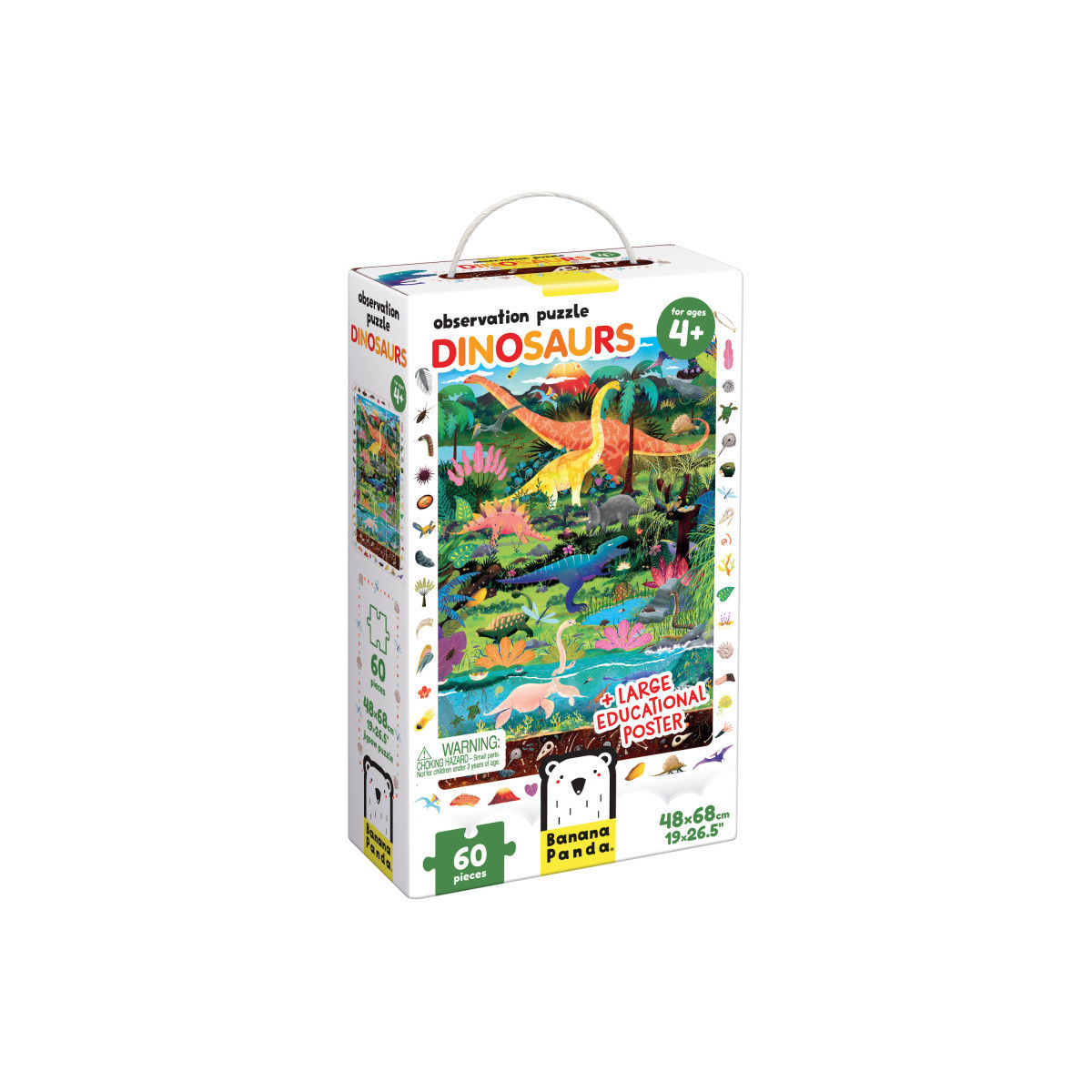 Welcome to the land of the dinosaurs! There are plenty of interesting things for little observers to find in this detailed and colorful 60-piece puzzle from Banana Panda! First, put the jigsaw puzzle together, and then search for the objects in the picture frame. Can you find them all? The large educational poster included in this set makes this puzzle a great creative and educational gift, encouraging young explorers to find out more about Earth's history.