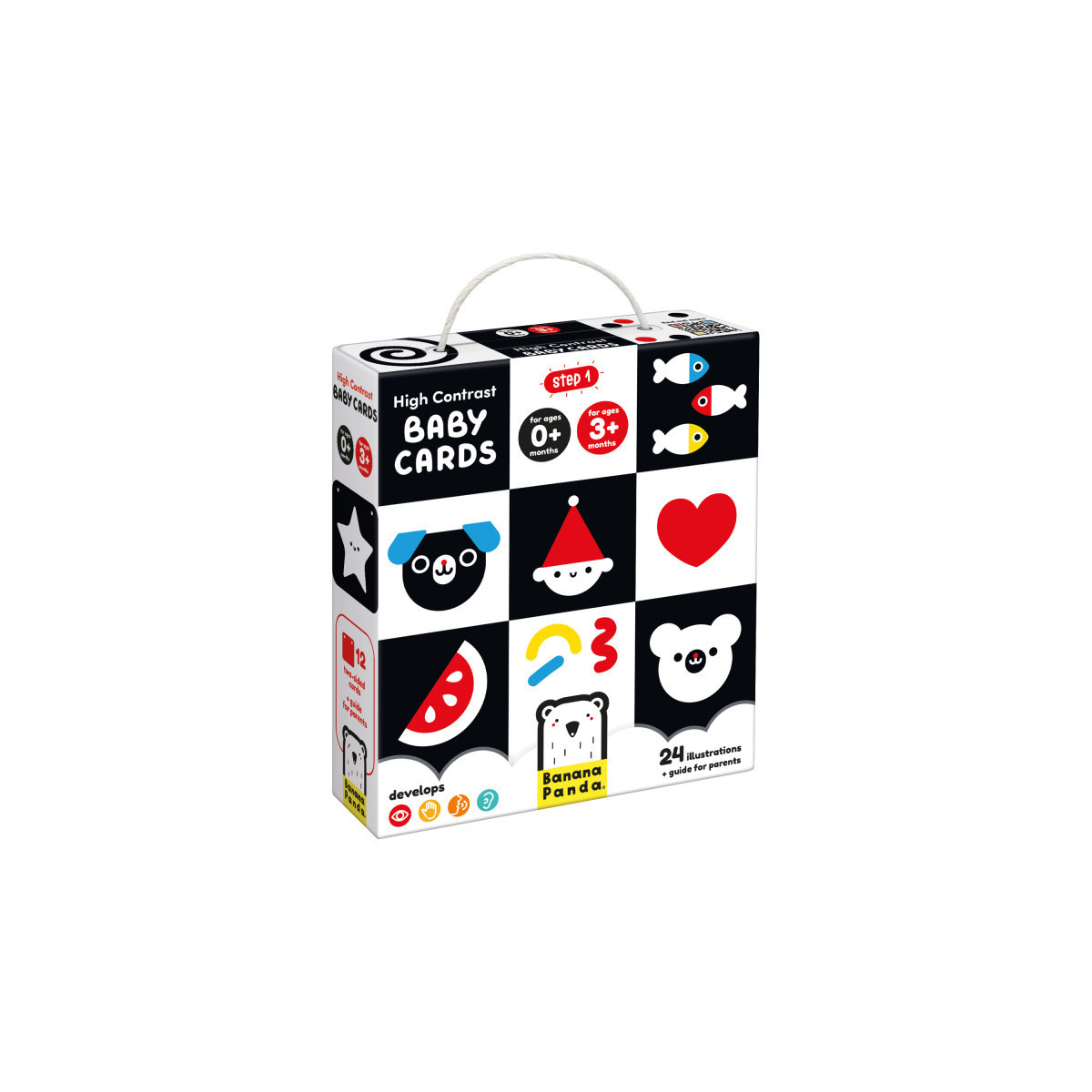 At birth, sight is still underdeveloped. At first babies see clear, high-contrast patterns best, and the ability to distinguish image details and colors gradually develops over the following months. That's why babies like contrasts so much. Parents can hang a booklet or individual cards by the bed or stroller, or create an effective garland. A lot of interesting and practical information about the development of babies and how to have fun together can be found in the guide attached to the set.
