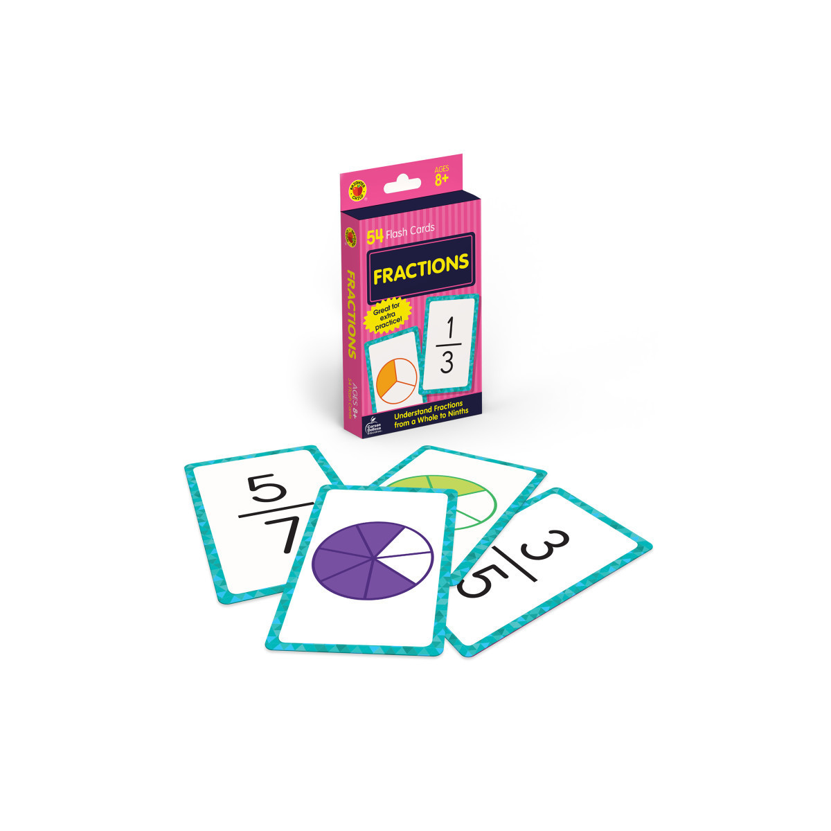 Carson Dellosa's Fractions Flash Cards present an easy fun way kids to practice essential math skills. This set includes 54 flash cards that illustrate fractions from a whole to ninths with images that represent each fraction to help students better understand what they look like. This set also includes a card that helps teach basic mathematical symbols, as well as a bonus game card. Flash cards allow kids to develop critical thinking, decision-making, turn-taking, other social skills while allowing them to learn a fun, hands-on way.