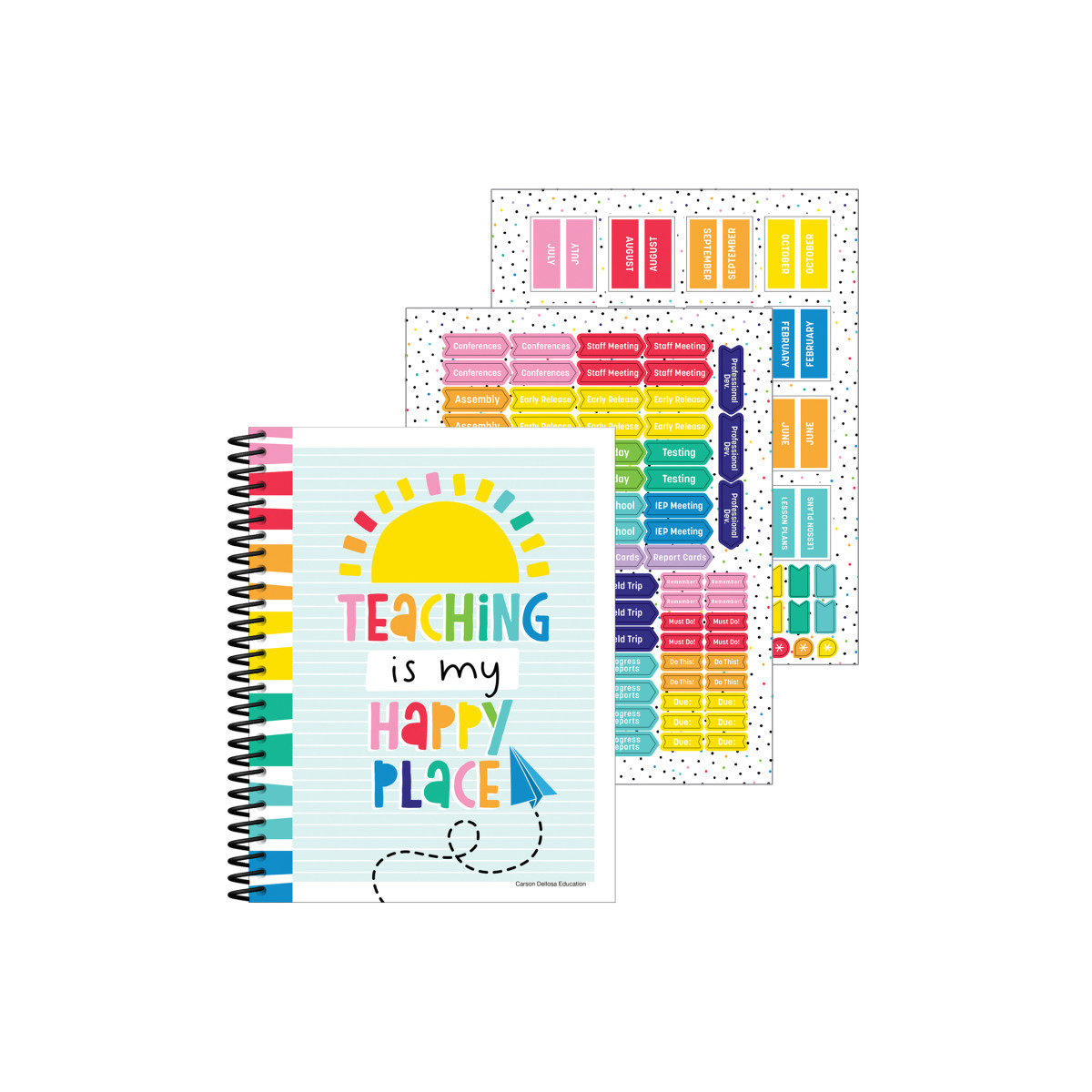 Organize your lesson plans, daily tasks, monthly and yearly schedules, grades, and more in style with Carson Dellosa's Happy Place Teacher Planner!