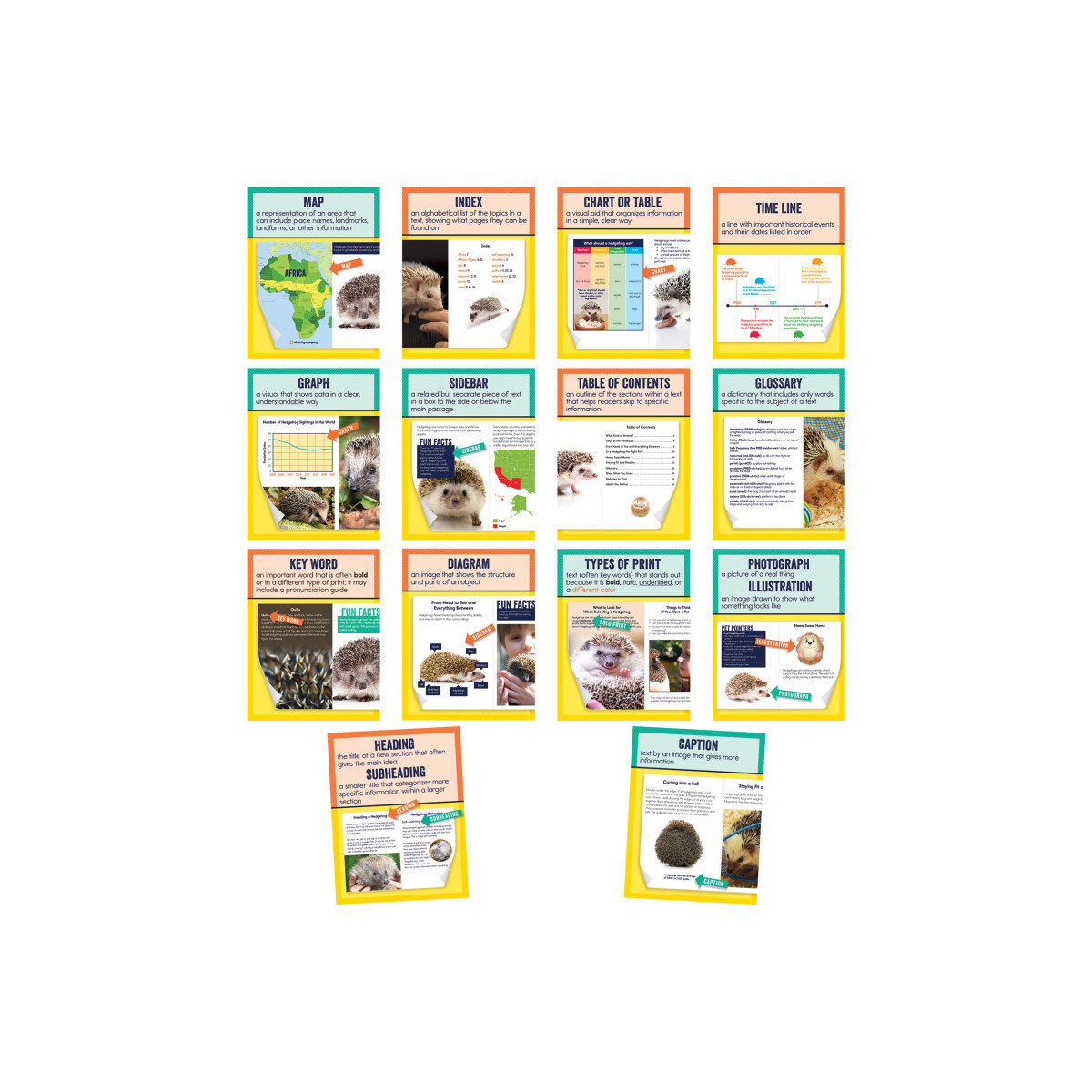 Enhance learning with a curriculum-rich visual reference. Featuring 14 mini posters (8.5" x 11"), the Nonfiction Text Features Mini Poster Set identifies the most common text features of nonfiction writing. This excellent curriculum resource makes it easy for students to distinguish between various nonfiction text features such as Caption, Glossary, Index, and more.Create a positive classroom environment with attractive and eye-catching mini poster sets. Use the versatile posters together to create large displays or separately to create several small displays. Our captivating posters will brighten any classroom with lively colors and trending patterns. Look for coordinating products to accent your displays and create a cohesive classroom theme.