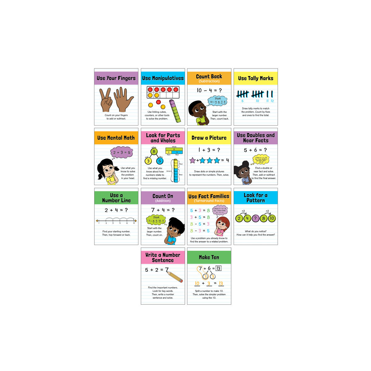 The Math Strategies Mini Posters set offers 14 essential math strategies in an engaging format to help students when they are stuck on math problems. These include using mental math, tally marks, a number line, manipulatives, fingers; drawing a picture; looking for parts and wholes; and more. Made from sturdy card stock, you can easily frame or laminate these posters to make sure they can be displayed for years to come.