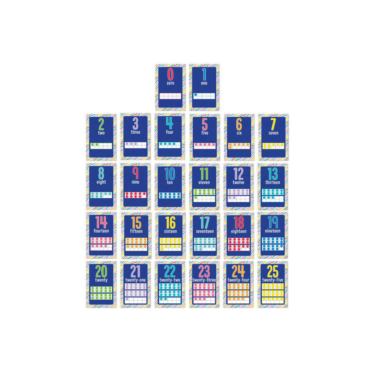 Teach students counting and number values the Number Cards Mini Poster set that features vibrant examples of each number's quantity. This 26-piece set is the perfect visual reference for your classroom to help children develop their math skills and learn the values of numbers 0-26.