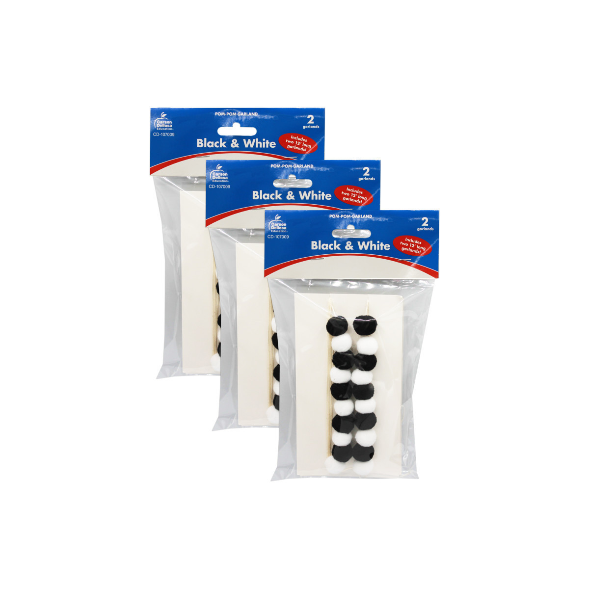 Decorate any corner of your learning space in style with Carson Dellosa's Black and White Pom Garland Set! Each pack features two 12-foot strings of pom-pom garlands, each garland features 20 black and white pom-poms for a total of 40 pom-poms. Use the garland to add the perfect finishing touch to solo displays or multiple learning visuals, creating a single layer design or adding layers to create dimension to your displays. This garland features classic colors that are great for white and black décor, holiday décor, birthday decorations, office décor, and more—perfect for year-round use. Sold as 3 packs for a total of 6 garlands.