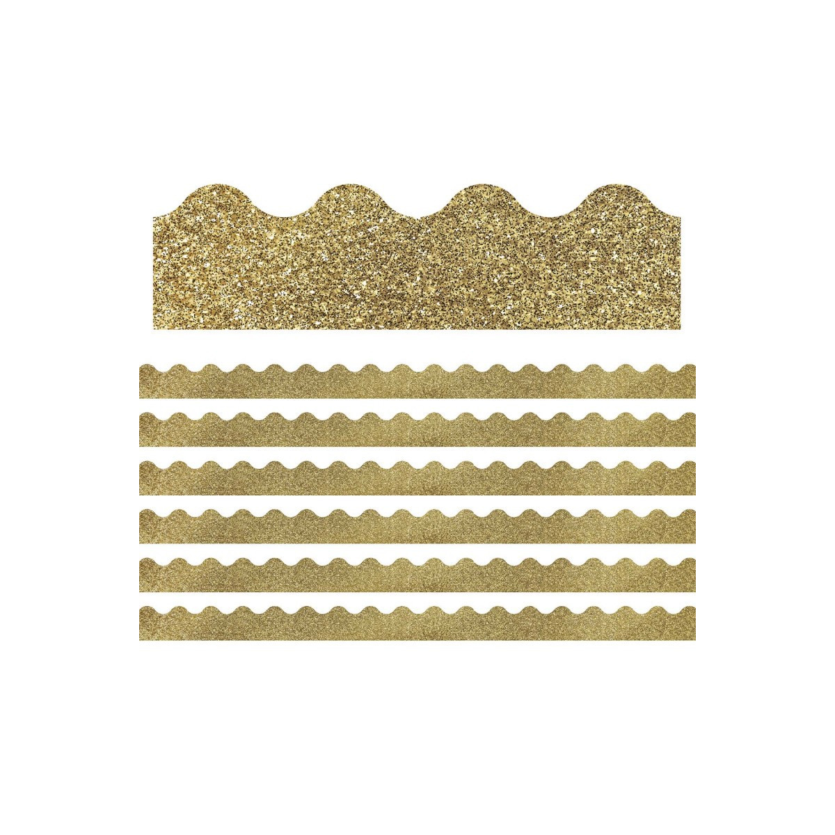 Enhance message boards with glitzy borders from the Sparkle + Shine collection. The Sparkle + Shine Gold Glitter scalloped border pack features all the glitter without the mess. Displays will dazzle with classroom borders. With these easy-to-customize borders, creating unique displays is easier than ever. Cut and layer borders to add dimension. Don't forget to look for coordinating Sparkle + Shine products to complement your classroom theme. Each pack includes 13 strips each measuring 3' x 2.25" for a total length of 39'. Sold as 6 packs for a total of 234 feet (78 strips).