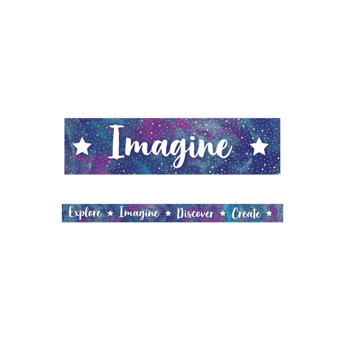 Give your bulletin board displays the perfect finishing touch with straight borders. Galaxy Straight Borders feature a marbled blue and purple background with the motivational phrases Explore, Imagine, Discover, and Create. This border pack includes 12 strips—each measuring 3' x 3" for a total length of 36'.