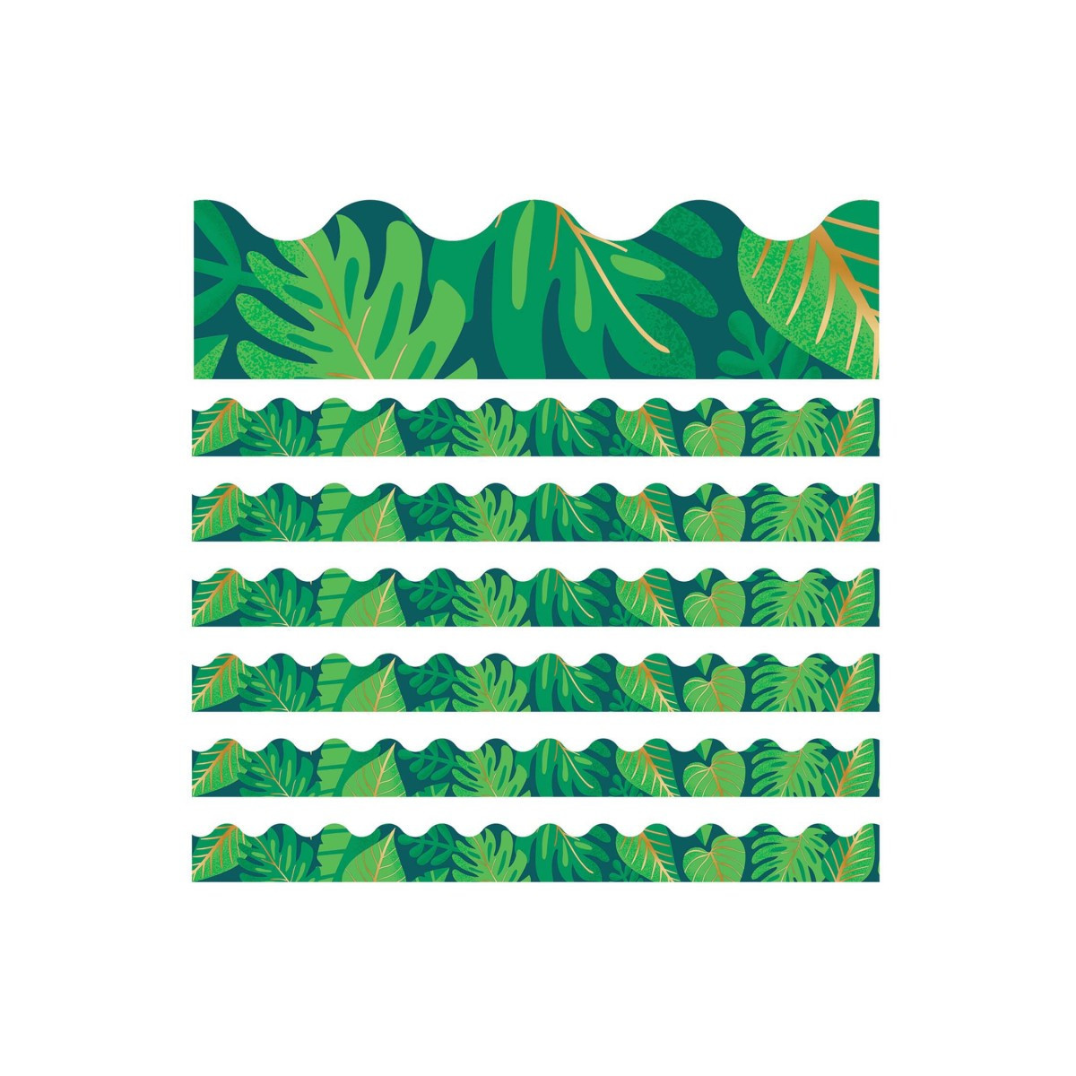 Bring the feel of the tropics to your classroom! Give your bulletin board displays the perfect finishing touch with eye-catching border trim. This pack of One World Tropical Leaves Scalloped Borders includes 13 border strips, each measuring 3' x 2.25" for a total length of 39'. Sold as 6 packs for a total of 78 border strips (234 feet).