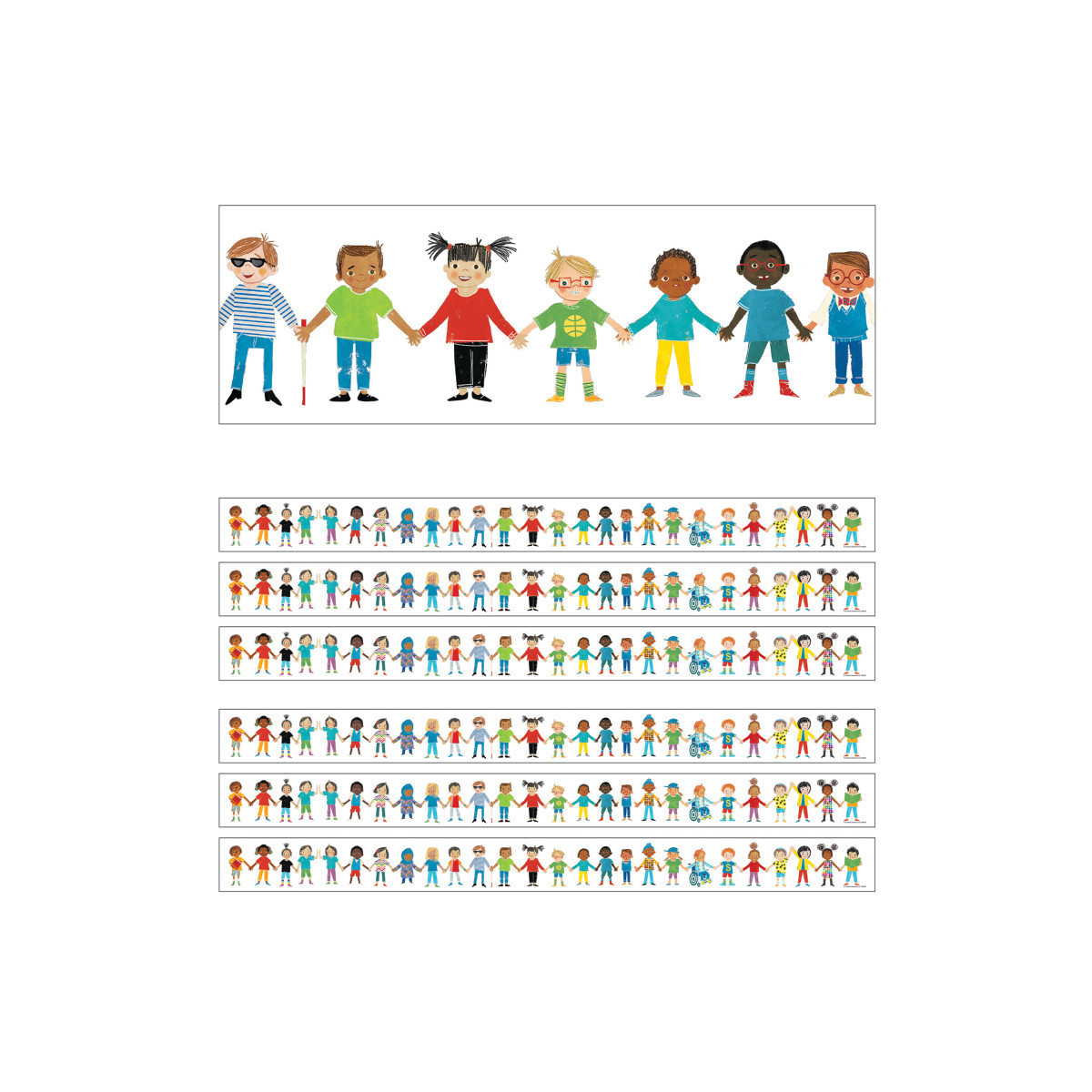 Give your bulletin board displays the perfect finishing touch with eye-catching border trim. These eye-catching borders feature a colorful, friendly line of beautiful children from different cultures. Each All Are Welcome Kids Straight Borders pack includes 12 border strips, each measuring 3' x 3" for a total length of 36 feet per pack. Sold as 6 packs for a total of 72 strips (216 feet).