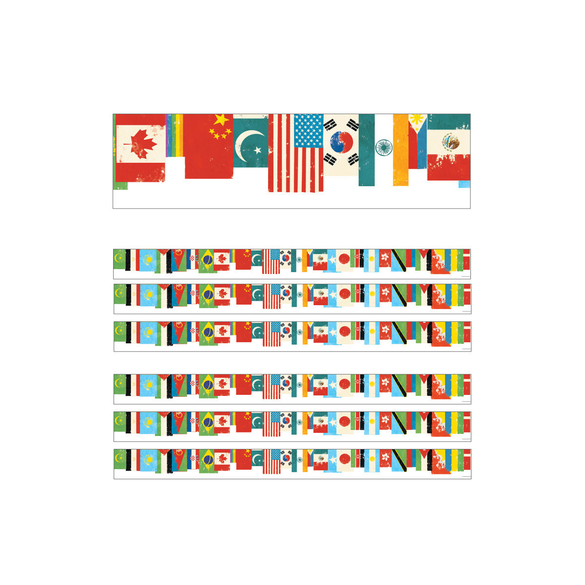 Give your bulletin board displays the perfect finishing touch with eye-catching border trim. These eye-catching borders feature a colorful lineup of flags from around the world to signify the diverse backgrounds of any community. Each All Are Welcome Flags Straight Borders pack includes 12 border strips, each measuring 3' x 3" for a total length of 36 feet per pack. Sold as 6 packs for a total of 72 strips (216 feet).
