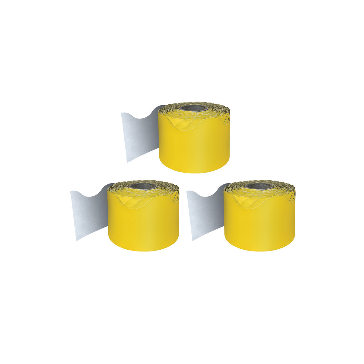 Carson Dellosa's Yellow Scalloped Bulletin Board Border brings added style to your classroom, dorm room, party, daycare, or homeschool setting. This set includes one roll of vibrant, yellow bulletin board border trim printed on thick but flexible paper that can be used for solo displays or multiple learning visuals. Decorate your learning space with a single layer border, or add layers to create dimension to your displays. This border is also great for holiday decor such as Easter as well as other spring or summer-themed decorations. This border is also great as a primary pop of color for any standard visual or decorative display. For a cohesive theme, check out coordinating Carson Dellosa teaching supplies and classroom decorations. Education happens everywhere, and Carson Dellosa strives to provide the tools needed to inspire learning everywhere it happens. Each rolled border measures 2 1/4 inches by 65 feet to decorate bulletin boards, desks, classroom walls, lockers, and more with ease. Sold as a pack of 3 rolls.