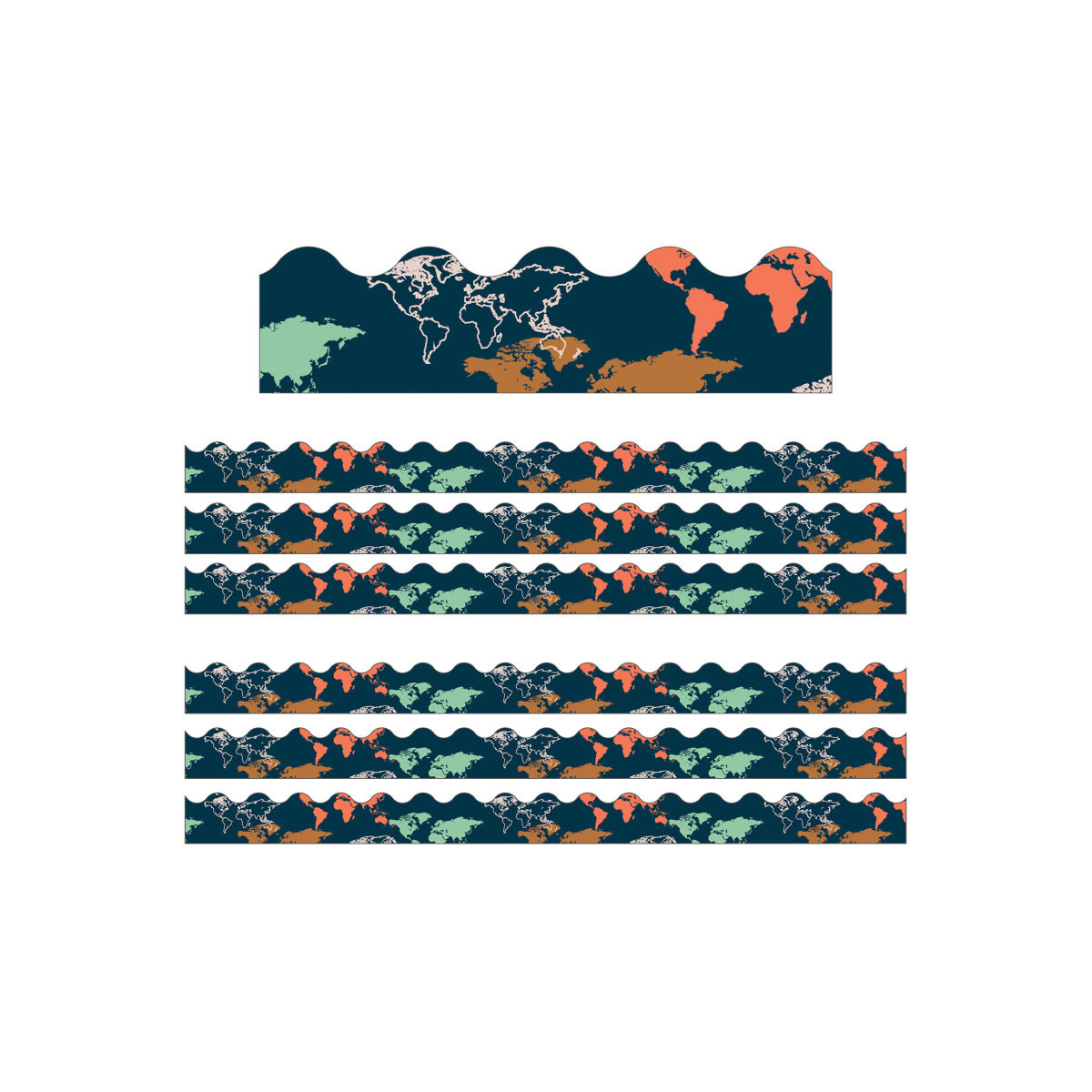 Decorate your space with vintage decorations with Carson Dellosa's Let's Explore World Map Scalloped Borders! The stunning bulletin border features all of the continents of the world in nostalgic colors to add a touch of adventure to your learning displays, wall decor, classroom borders, and more. Cut and layer your border to add dimension to any display. Each bulletin border set features 13 durable strips of bulletin board borders made from flexible yet thick paper, each measuring 3 feet by 3 inches for a total length of 39 feet—perfect for bulletin board decor, lockers, door displays, wall decor, and more! Sold as 6 packs for a total of 78 strips (234 feet).