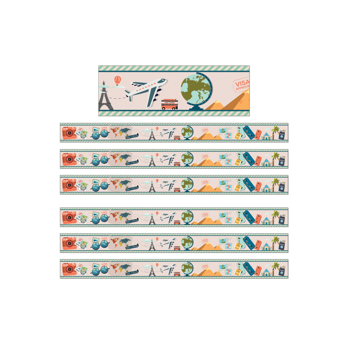 Decorate your space with vintage decorations with Carson Dellosa's Let's Explore Straight Borders! The stunning bulletin border features an assortment of travel icons in nostalgic colors to add a touch of adventure to your learning displays, wall decor, classroom borders, and more. Cut and layer your sunset border to add dimension to any display. Check out other Let's Explore products to create a cohesive classroom theme. Education happens everywhere, and Carson Dellosa strives to provide the tools needed to inspire learning everywhere it happens. Each bulletin border set features 12 durable strips of bulletin board borders made from flexible yet thick paper, each measuring 3 feet by 3 inches for a total length of 36 feet—perfect for bulletin board decor, lockers, door displays, wall decor, and more! Sold as 6 packs for a total of 72 strips (216 feet).