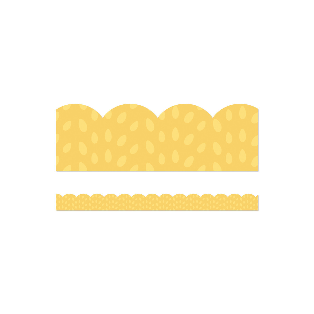 Bring thoughts of warmth and whimsy into your classroom with the calming shades of the Carson Dellosa Grow Together Yellow Bulletin Board Borders! Featuring 13 strips of scalloped bulletin board borders with a yellow painted polka dot design, each bulletin board border strip measures 3 feet x 3 inches for a total of 39 feet—perfect for white board, cork board, and other colorful décor needs. Cut and layer the bulletin board border to add dimension to any display with ease. Add yellow bulletin board borders to locker and desk décor, and other classroom décor or office décor, or incorporate into spring and summer bulletin board decorations for stylish seasonal displays.