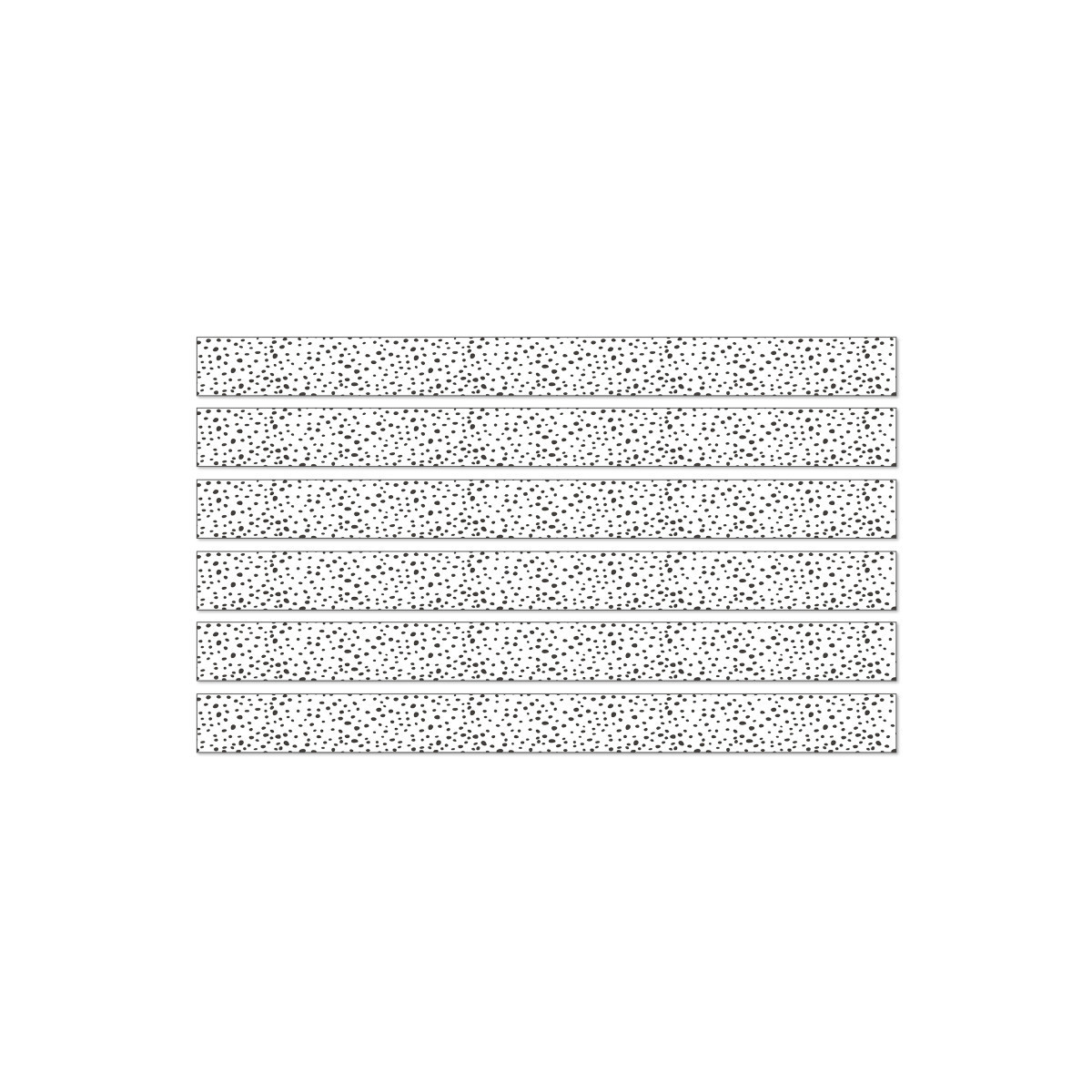 Add stylish, black and white classroom decor to your learning space using Carson Dellosa We Belong Black Dot Bulletin Board Borders—perfect for bulletin board, white board, cork board, and other classroom décor. The black and white bulletin board paper set includes 12 strips of straight, white bulletin board borders with a black leopard print design throughout each strip of border. Each strip of bulletin board border measures 3' x 3" for a total of 36 feet to decorate doors and wall displays, cubbies, chalkboards, and other border needs. White and black décor is a great addition to year-round party, black board, and bulletin board decorations, office décor, locker, desk décor, and more. Sold as 6 packs for a total of 72 strips (216 feet).