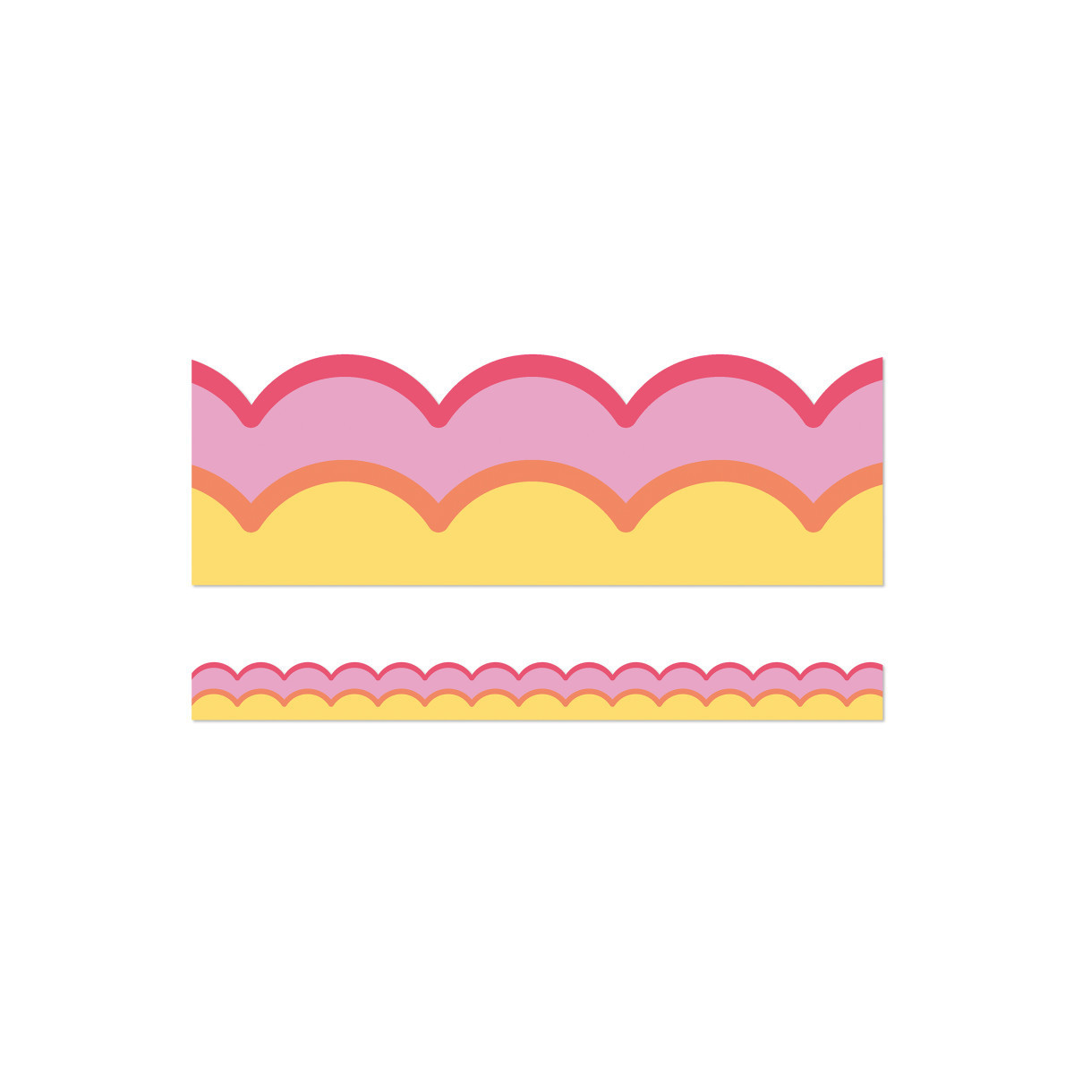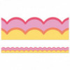 Add a wave of color to your party décor or classroom décor with Retro Remix Warm Waves Bulletin Board Borders! The border trim includes 13 strips of scalloped pink and yellow bulletin board border with a hot pink and orange border. Each strip of border measures 3' x 3" for a total of 39ft to dress up lockers, cubbies, bulletin board, cork board, and white board displays with ease. The classroom border is printed on thick but flexible bulletin board paper that you can cut and layer to add dimension to any display. Retro Remix, designed by Stephanie and Loreal of @HappilyEverElementary, partnered with Carson Dellosa to bring some fun, retro vibes to your learning environment.