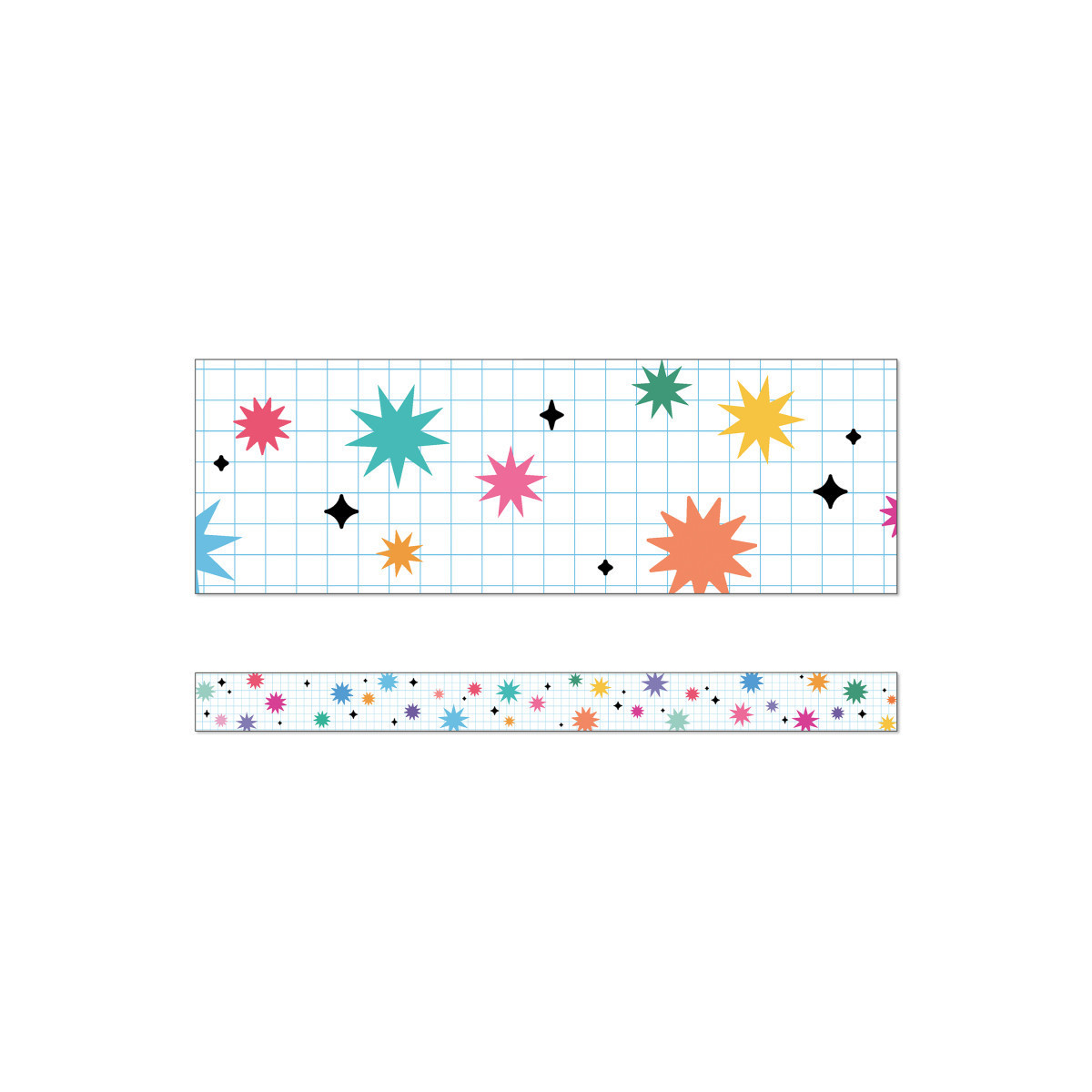 Watch your classroom décor burst to life with the help of Retro Remix Groovy Bulletin Board Borders! The border trim includes 12 strips of straight bulletin board border with bursts and twinkle designs on each strip of border. Each strip of border measures 3' x 3" for a total of 36ft to dress up lockers, cubbies, bulletin board, cork board, and white board displays with ease. The classroom border is printed on thick but flexible bulletin board paper that you can cut and layer to add dimension to any display. Retro Remix, designed by Stephanie and Loreal of @HappilyEverElementary, partnered with Carson Dellosa to bring some fun, retro vibes to your learning environment.
