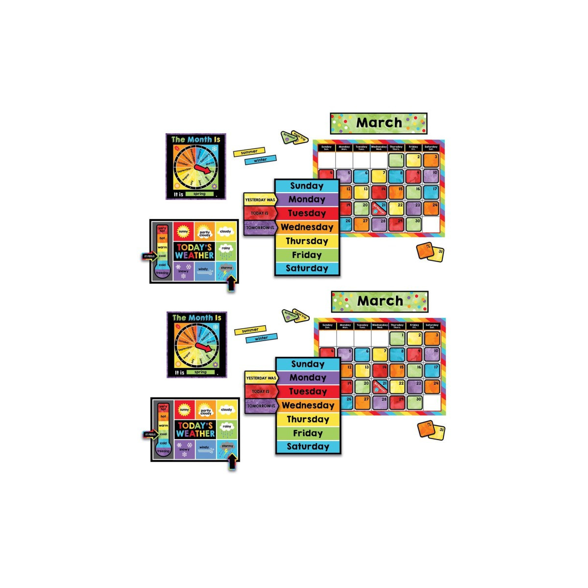 The 86-piece Celebrate Learning Calendar bulletin board set provides everything you need to create a display that helps students stay up-to-date with days, months, seasons, holidays, and more.