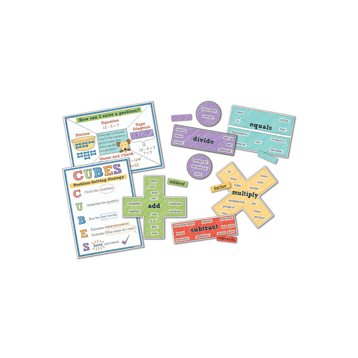 This 54-piece teaching décor set reinforces problem-solving strategies and keywords to help students grasp essential math concepts.