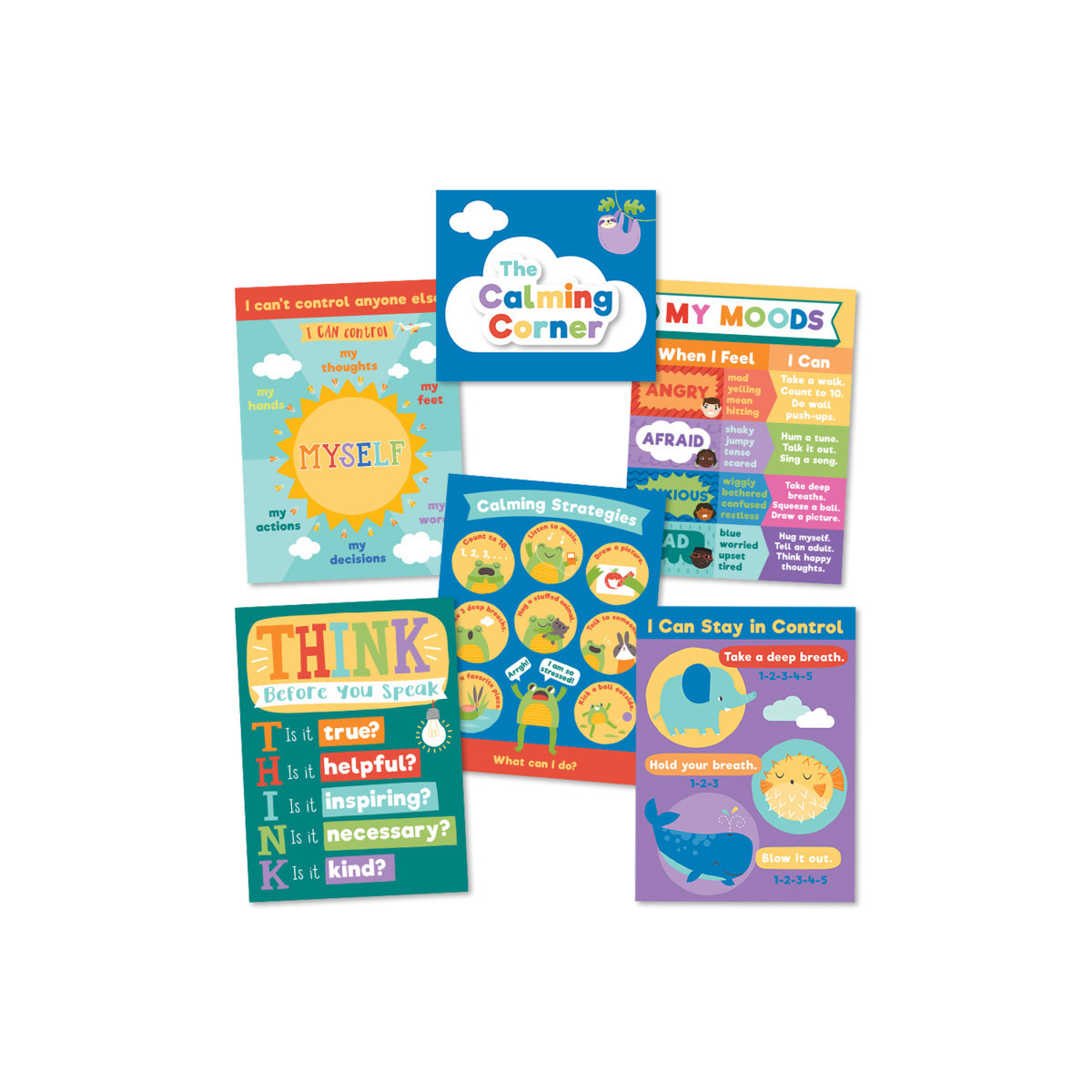 The 7-piece Calming Strategies Bulletin Board Set is designed with soothing colors and features ways for students to deal with negative emotions. This set includes these pieces:• 1 blank header (15" x 17")