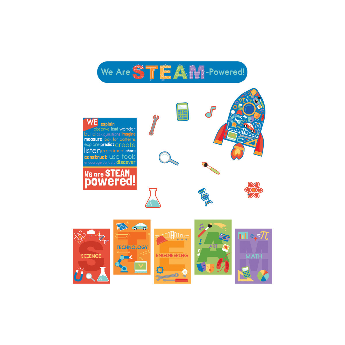 Motivate students to learn more about science, technology, engineering, art, and math with the 22-piece STEAM Bulletin Board. The delightful art style of the posters in this set will encourage your students to go full steam ahead! This bulletin board set includes these pieces:• 1 header, assembled from 2 pieces (12.7" x 22.5")