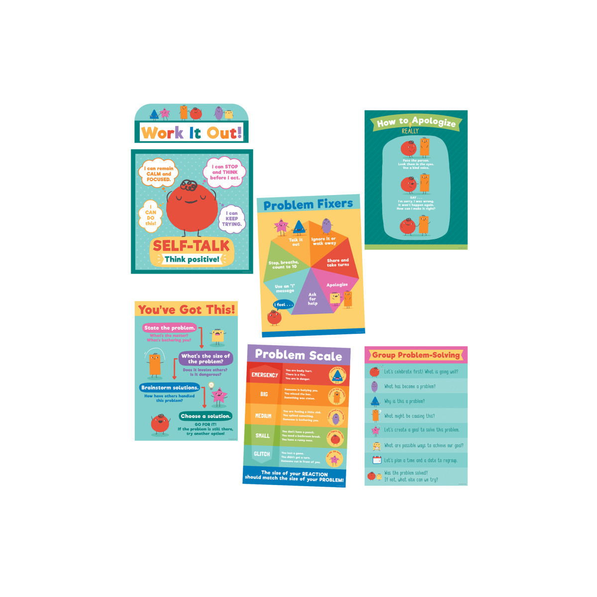 Teach your students positive strategies for independent problem-solving with the 7-piece Social Problem-Solving Bulletin Board. This SEL set includes 1 header and 6 colorful posters with delightful characters who encourage students to work it out, featuring problem-solving solutions and positive self-talk. Sizes for this bulletin board set are:• 1 header (15.7" x 5.4")