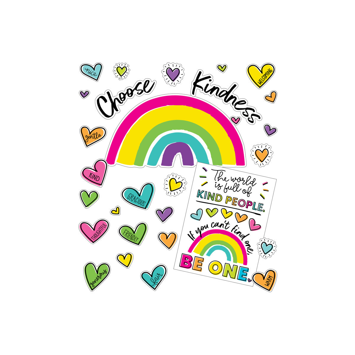 Create an encouraging mood in your classroom with the Kind Vibes Choose Kindness Bulletin Board. Featuring a large rainbow, hearts, kind words and more, this versatile set is sure to add a cheerful touch to the classroom. This set includes these 75 pieces:• 1 message, assembled from 2 pieces (choose: 12.95" x 8.1"; kindness: 15.81" x 9.68")