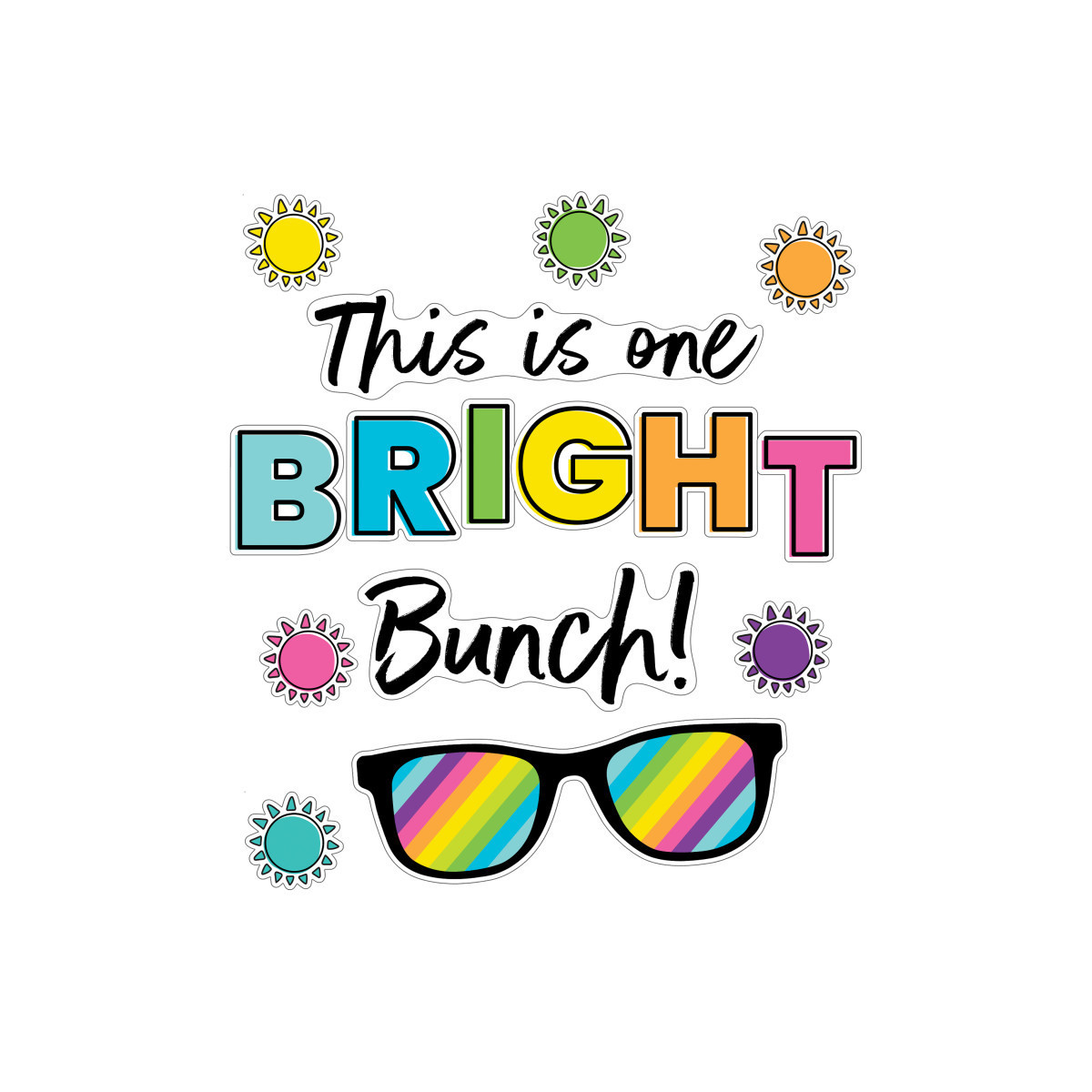 Create an encouraging mood in your classroom with the Kind Vibes This Is One Bright Bunch Bulletin Board. Featuring large, rainbow-tinted sunglasses and bright suns, this versatile set is sure to add a touch of animated positivity to the classroom. This set includes these 39 pieces: • 1 pair of sunglasses (20.18" x 6.75")
