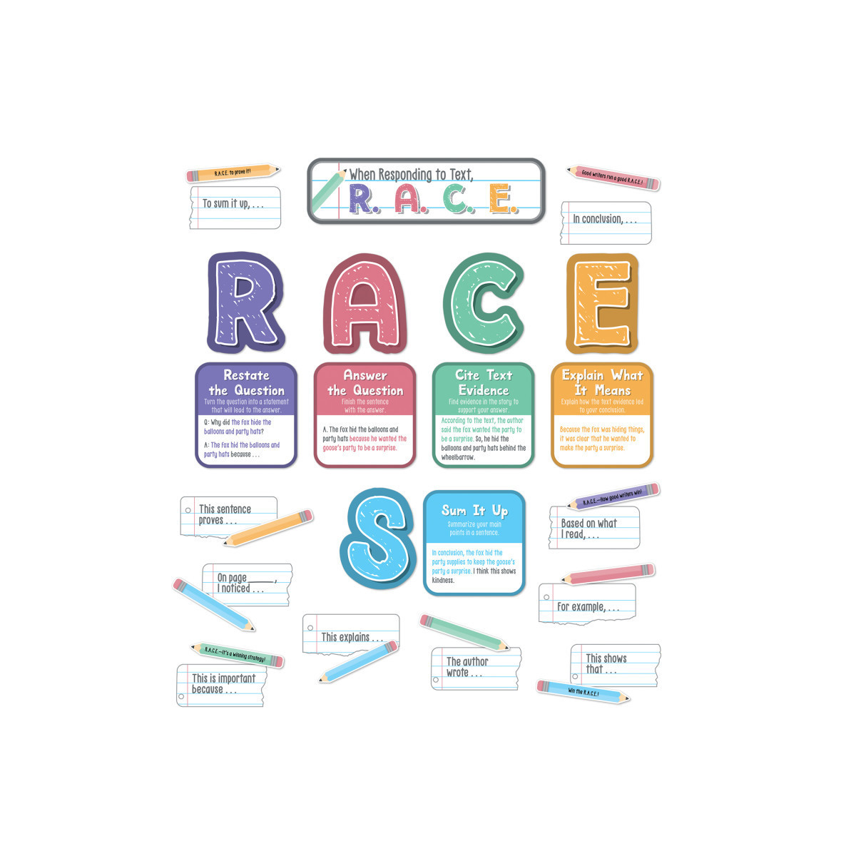 Turn your bulletin boards and visual displays into writing fun with Carson Dellosa's R.A.C.E. Writing Strategy Bulletin Board Set! The 37-piece bulletin board bundle provides visual reinforcement to teach and strengthen students' constructed written responses to what they are reading, with a reference that teaches and reinforces the R.A.C.E. (S) strategy. The set includes a 2-piece header and 5 letters (R, A, C, E, and S). The set also includes 5 informational charts, 5 motivational phrase pencils, 13 sentences starters, and 7 blank pencil cutouts. The set includes explanations and sentence stems for each letter of the R.A.C.E. strategy and includes an S (for Summarize) if you teach it.