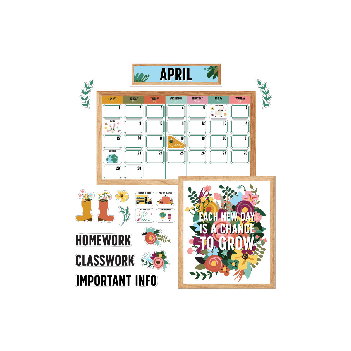 Teach your students essential calendar skills while staying organized with the Carson Dellosa Grow Together Calendar Bulletin Board Set! Perfect for bulletin board, cork board, white board displays, and more, the 134-piece classroom supplies set includes a 23" x 14" wall calendar with monthly, homework, classwork, and important info headers ranging in size from 11" x 6"—13" x 3.4", 2.7" x 2" numbers, birthday, holiday, special occasion, and blank cover ups, a 16" x 13.7" motivational poster, and plant décor, flower décor, and rainboot bulletin board cutouts. Use the monthly calendar to display birthdays, special occasions, holidays, and more, while using the homework, classwork, and important info headers to display and organize assignments year-round.