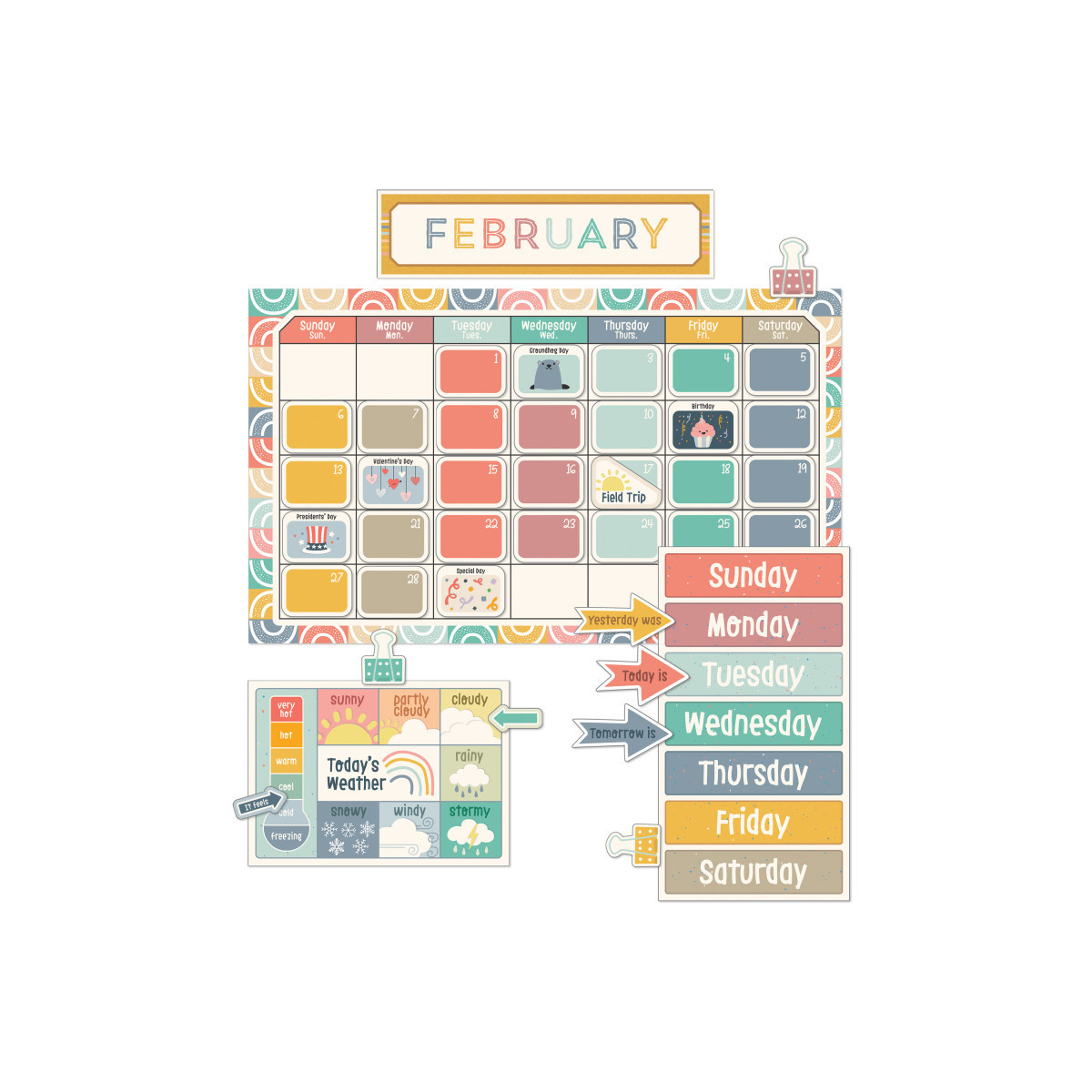 Teach your students weather, seasons, and essential calendar skills while staying organized with the Carson Dellosa We Belong Calendar Bulletin Board Set—perfect for bulletin board, cork board, and white board displays. The 137-piece set includes a 23" x 13.8" wall calendar with 13" x 3.4" monthly headers, numbers, birthday, holiday, special occasion, and blank cover ups (2.7" x 2" each), a 7.6" x 13.8" days of the week chart, days-of-the-week arrows and 3 binder clip accents (4" x 2.6" each) a 10.2" x 7.2" weather chart, 4 weather chart arrows (2.1" x 1"each), an 8.3" x 10.2" seasons-month chart, 5 season overlays (4.2 x 0.6"each), and a 2.7" x 1.2" arrow.
