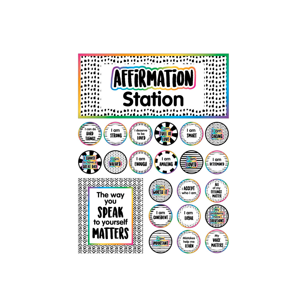 Create a positive learning environment that inspires students to keep trying and believing in themselves with Carson Dellosa's Affirmation Station Bulletin Board Set! The 32-piece classroom décor bulletin board set includes a 32" x 13.7" "Affirmation Station" header, 30 positive affirmations (5" x 5"), and "The way you SPEAK to yourself MATTERS" motivational poster (13.8" x 16")—all made from durable materials to dress up cork board, white board, growth mindset décor, bulletin board décor, and other visual displays with ease. The bulletin board set includes inspirational quotes such as "I deserve to be LOVED", "Mistakes help me LEARN", "The world NEEDS ME", and more. Positive affirmations help students build social-emotional learning skills and self-esteem by replacing negative thoughts with positive ones for a healthy growth mindset that will help them succeed both in and out of the classroom.