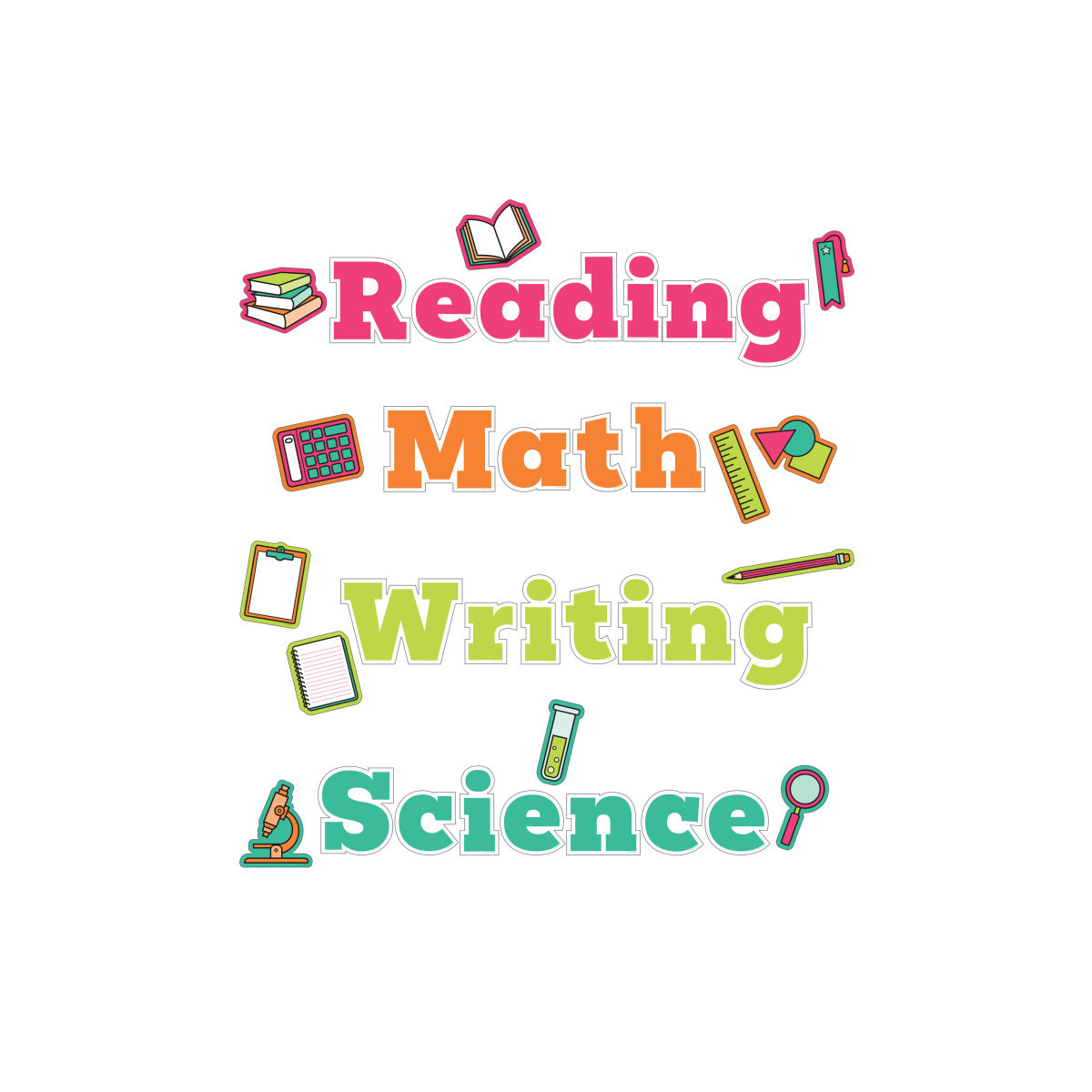 The bulletin board set is a decorative way to highlight reading, writing, math, and science