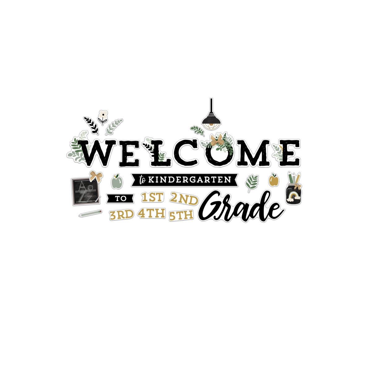 Create a warm and welcoming learning environment for students with inspiring classroom décor and office décor using the Carson Dellosa Farmhouse Welcome Bulletin Board Set! The 41-piece bulletin board décor set includes "welcome" bulletin board letters (61.3" x 12.7" assembled), and 8 grade level accents ranging in size from 6.2" x 2.9" to 27" x 3.5". The bulletin board set also includes 2.5" x 3.6"—3.7" x 5.5" leaves, 2.9" x 3.9"—3.3" x 4.3" apples, and 3" x 4.2" flower bulletin board cutouts. Rustic décor such as 8.8" x 5.4" hanging lights, a 6.5" x 1" pencil, 4.5" x 9.2" pencil cup, a 7.8" x 7.5" chalkboard, and a 3.8" x 3.4" bow are also included.