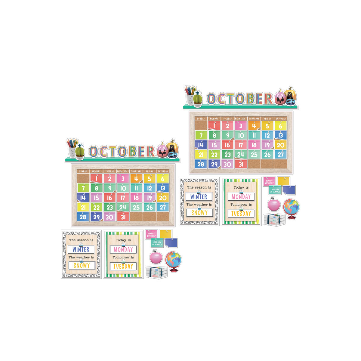 Teach your students weather, seasons, and essential calendar skills in one organized place with Carson Dellosa's Creatively Inspired Calendar Bulletin Board Set—perfect for bulletin board, white board, and other displays. Each 118-piece set includes a 21.75" x 13.29" wall calendar with boho rainbow bulletin board letters ranging in size from 1.35" x 2.25"—2.6" x 2.6" to create monthly headers. The classroom supplies set also includes 2.69" x 2.1" numbers, special occasion, and blank cover ups to customize your classroom calendar with ease. Decorate your bulletin boards with the included 24" x 1.39" shelf, assembled from 2 pieces, with 21 seasonal shelf accents ranging in size from 1.4" x 3.81"—4.13" x 5.57". The calendar bulletin board set also includes a 8.48" x 10.2 days of the week chart with 5.78" x 2.45" days of the week cards, a 8.48" x 10.2" seasons/weather chart with 5.78" x 2.45" season cards and weather cards. Use the monthly calendar to display birthdays and special occasions, the days of the week chart and seasons/weather chart to reinforce days, seasons, and weather skills, and more. The Creatively Inspired collection, designed by Stephanie and Loreal of @HappilyEverElementary, partnered with Carson Dellosa to help create a vibrant, positive, and creative environment that inspires students to learn. Sold as a pack of 2 complete calendar bulletin board sets.