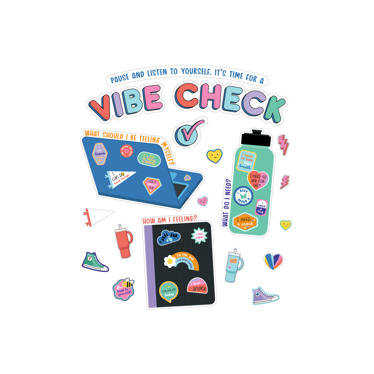 Keep the good vibes going in your classroom with the Carson Dellosa We Stick Together Vibe Check Bulletin Board Set! Perfect for bulletin board displays, calm down corner decorations, and other year-round visuals for social emotional growth, the 51-piece bulletin board set features water bottle, notebook, and laptop accents to display student feelings, needs, and thoughts in a stylish yet organized way.