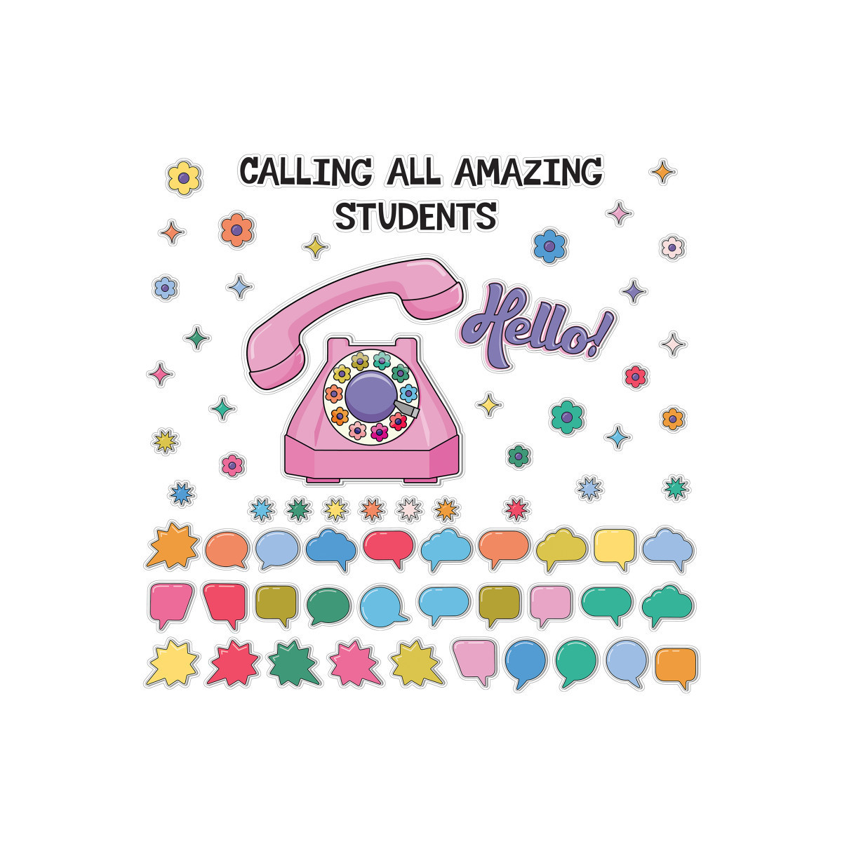 Cell-ebrate all your students hard work throughout the schoolyear by decorating your learning space with the Retro Remix Hello! Calling All Amazing Students Motivational Bulletin Board Set! The 71-piece bulletin board set includes a 5-piece header (45.6" x 3.15" to 15" x 8.77") 3-piece telephone (22.59" x 17.26"), 30 speech bubbles (Largest: 5.11" x 5.13", Smallest: 4.51" x 4.53"), 10 flowers (Largest: 3.56" x 3.82", Smallest: 2.58" x 2.64"), 12 twinkles (2.68" x 2.58"), and 11 starburst classroom decorations (2.79" x 2.66") to dress up your bulletin board, white board, cork board, or wall décor with ease. Use the speech bubbles to create name labels for students, while using the retro décor to accentuate student work displays that will inspire them to keep up the good work. Retro Remix, designed by Stephanie and Loreal of @HappilyEverElementary, partnered with Carson Dellosa to bring some fun, retro vibes to your learning environment.