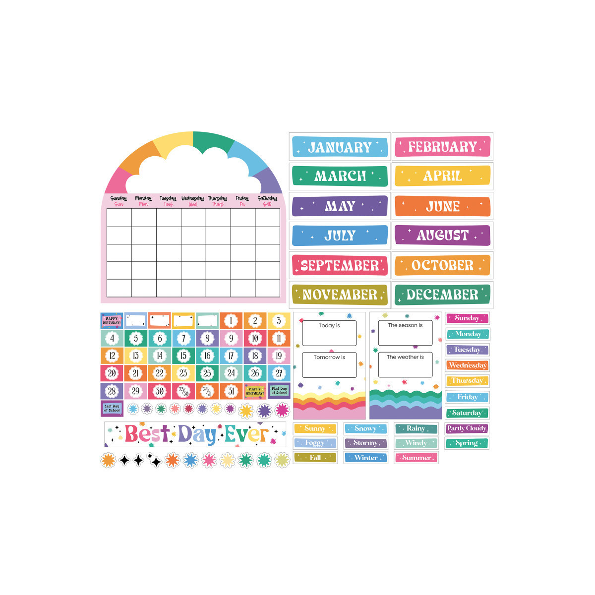 Add some retro vibes to your homeschool or classroom monthly calendar displays with the Happily Ever Elementary Retro Remix Calendar Bulletin Board Set! The 107-piece set includes a 22" x 3" banner, a 22.5" x 20.8" monthly calendar (assembled from 2 pieces), monthly headers, 8.75" x 13" seasons/weather and days of the week chart with 5.37" x 1.5" seasons and weather cards. The wall calendar set also includes number, special occasion, and blank cover ups (2.75" x 2"), as well as twinkle and starburst retro decor. This vintage wall calendar set helps reinforce schedules, important dates and holidays, days of the week, seasons, weather, and more essential skills and is the perfect size for bulletin board, cork board, white board, and other wall displays.