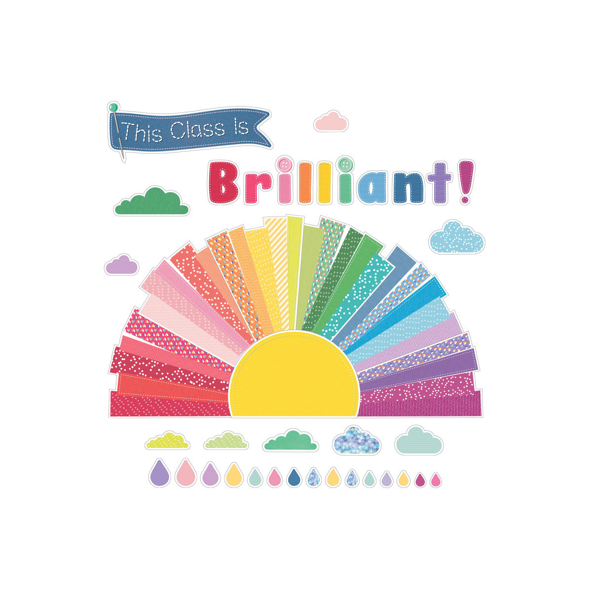 Inspire your students year-round with encouraging classroom decorations using Carson Dellosa's Crafty and Cool Motivational Bulletin Board Set! The 69-piece bulletin board set includes a "This Class Is Brilliant!" header assembled from 11 pieces (largest: 19.15", smallest: 2.02" x 5.27"), a 7-piece sun (assembled size: 44.61" x 25.37"), 9 clouds (largest: 6.5" x 3.97", smallest: 4" x 2.16"), 6 patches of grass (largest: 8.81" x 3.49", smallest: 5.2" x 2.16"), and 36 raindrops (largest: 2.53" x 3.37", smallest: 1.34" x 1.75"). Use the raindrop accents to display student names, or showcase student work underneath the inspirational banner throughout the schoolyear. Create vibrant wall decor, or decorate your bulletin board, white board, and cork board displays with ease.