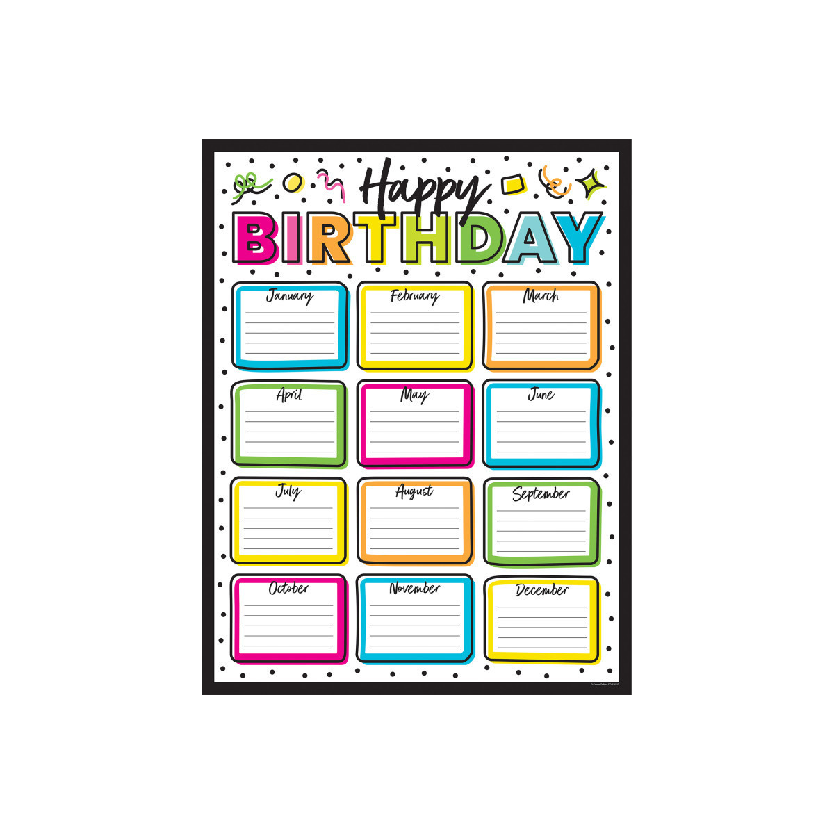Display students' birthdays year-round on the Kind Vibes Birthday Chart. With bright colors and a "Happy Birthday" header, this 17" x 22" chart features a separate writing space for each month, making it fun and easy to customize.