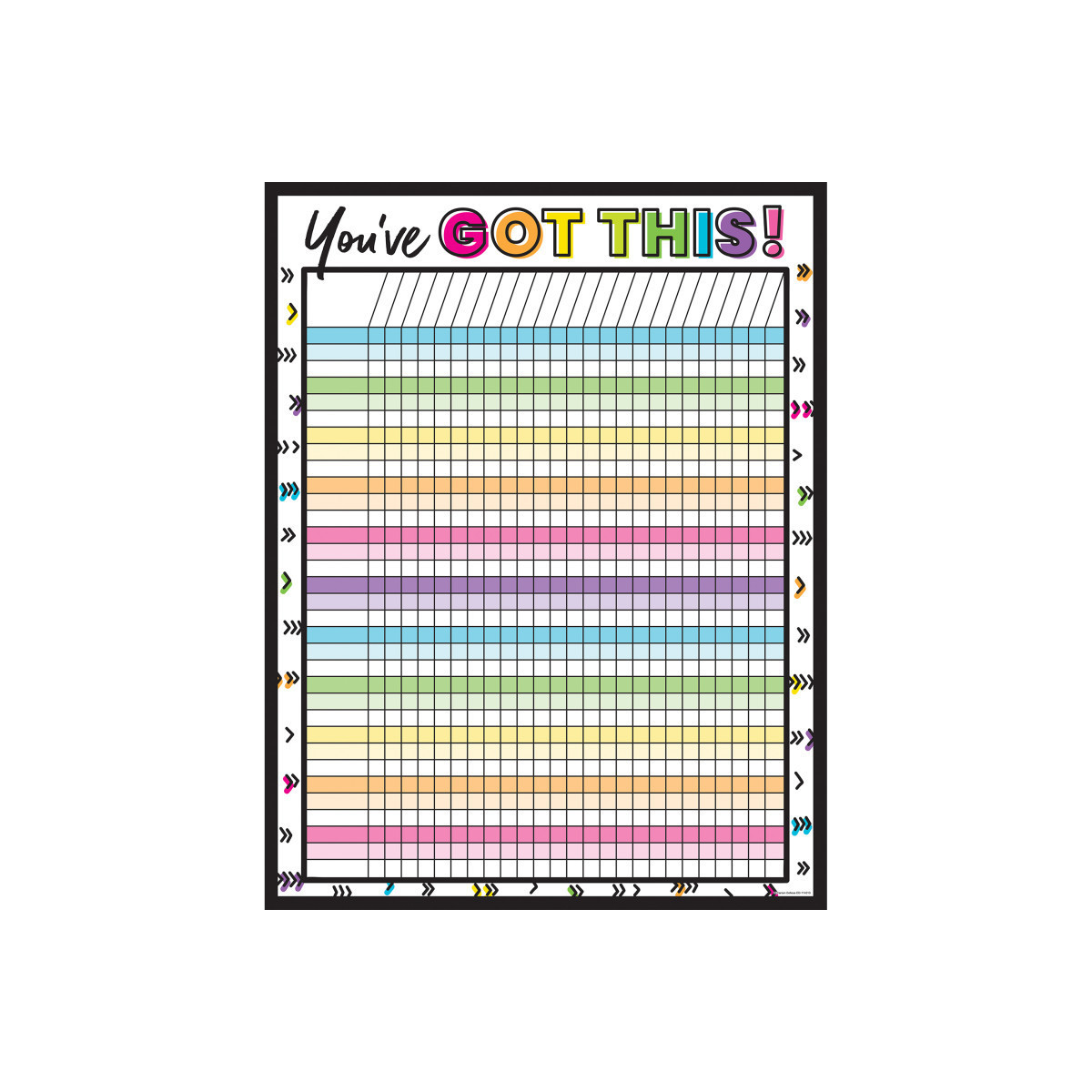 Recognize students' efforts and track their progress with the Kind Vibes Incentive Chart. Featuring the header "You've Got This!" and beautiful, vivid colors, this 17" x 22" chart displays a separate writing space for each student's name amid an easy to see grid pattern.