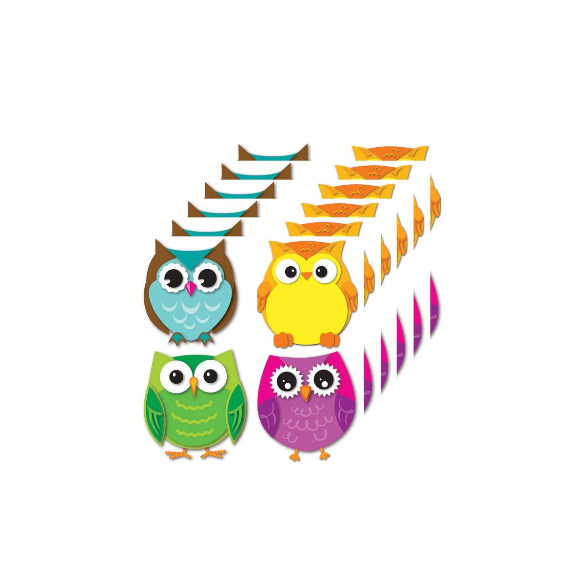 A fun and budget-friendly way to decorate your classroom! The Colorful Owls assorted Mini Colorful Cut-Outs® are versatile by design—the pieces can be used for name tags, games, calendar activities, and more. Add a little flair to any environment by decorating with this charming set. Each pack includes 36 cut-outs measuring 3" x 3" colorful owls: 10 orange, 8 purple, 6 blue, 4 teal, 4 yellow, 2 green, and 2 pink. Sold as 6 packs for a total of 216 cut-outs.