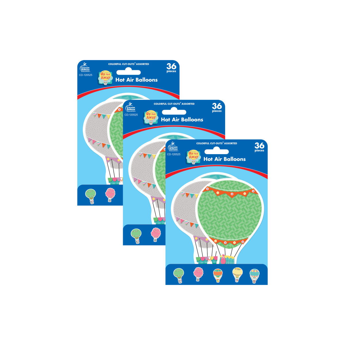 Decorate displays and play games with the Up and Away Hot Air Balloons Colorful Cut-Outs®. Each pack includes 36 hot air balloons (largest 5.05" x 7", smallest 4.84" x 6.75") in a variety of shapes and colors—perfect accents for bulletin boards and message displays. Sold as 3 packs for a total of 108 cut-outs.