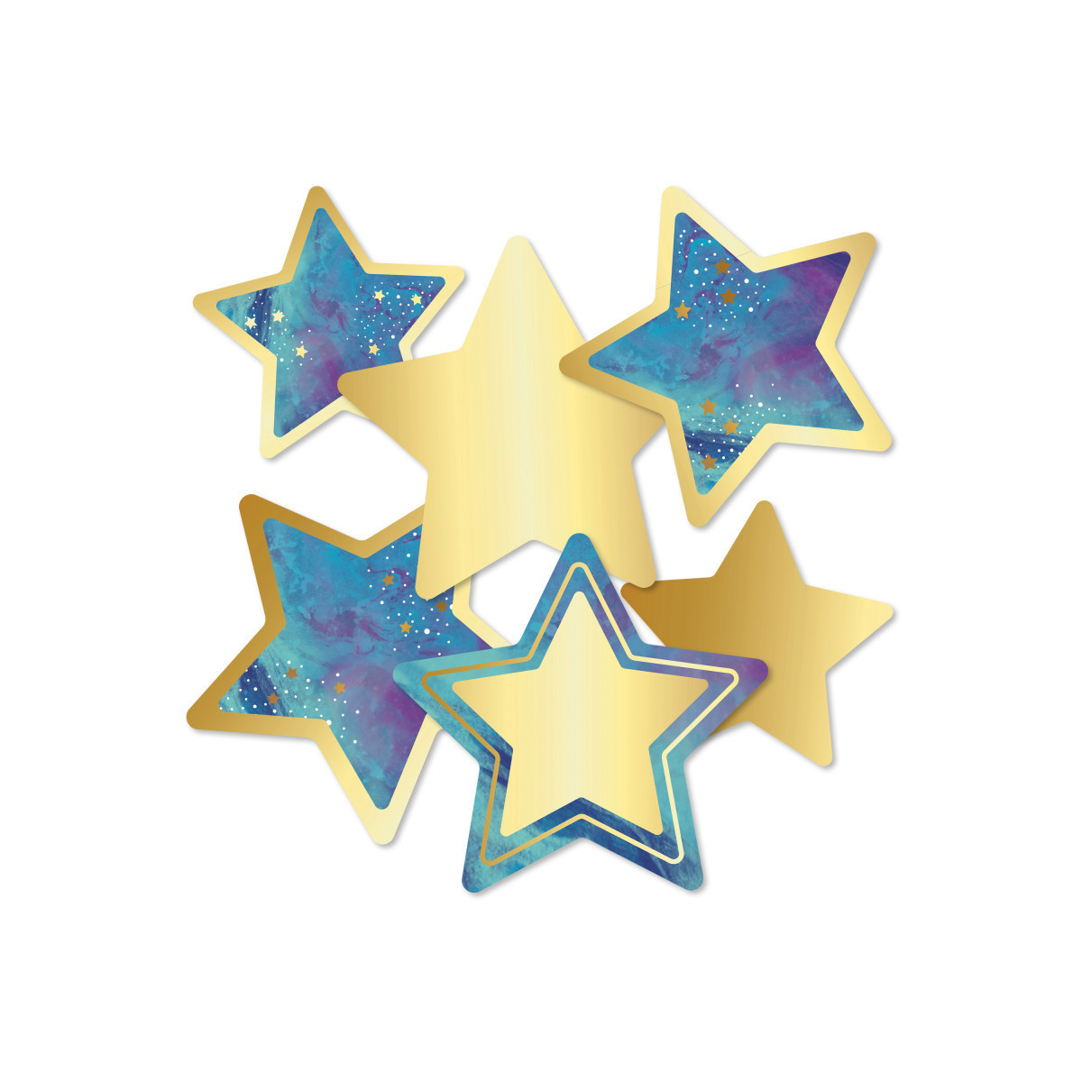 Decorate displays and play games with the Galaxy Stars Colorful Cut-Outs®. This pack includes a total of 36 cut-outs in three different sizes. This assortment includes:• 18 large stars (5 1/2"), 6 each: gold border, gold center, solid gold